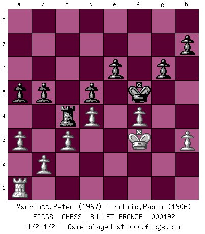 Last move : 1/2-1/2 2010 April 11 3:49:22 [Event "FICGS__CHESS__BULLET_BRONZE__000192"] [Site "FICGS"] [Date "2010.04.11"] [Round "1"] [White "Marriott,Peter"] [Black "Schmid,Pablo"] [Result "1/2-1/2"] [WhiteElo "1967"] [BlackElo "1906"] 1.Nf3 Nf6 2.Nc3 d5 3.d4 g6 4.Bf4 Bg7 5.e3 O-O 6.Be2 c5 7.dxc5 Nbd7 8.O-O Nxc5 9.Be5 b6 10.Qd4 Bb7 11.Qb4 a5 12.Qh4 Nfe4 13.Bxg7 Kxg7 14.Nxe4 Nxe4 15.Ng5 Nxg5 16.Qxg5 f6 17.Qg3 Qb8 18.f4 e6 19.Qg4 Rf7 20.c3 Qc8 21.Rad1 f5 22.Qh4 Ba6 23.Qf2 Bxe2 24.Qxe2 Rc7 25.Rd4 Qa6 26.Qxa6 Rxa6 27.Kf2 b5 28.a3 Ra8 29.Kf3 Rac8 30.Rfd1 Kf6 31.g4 fxg4+ 32.Kxg4 Rc4 33.Kf3 R8c5 34.h3 Rxd4 35.exd4 Rc4 36.Ra1 Kf5 37.Ra2 Rc7 38.Ra1 Rc4 39.Ra2 Rc7 40.Ra1 Rc4 1/2-1/2 Reti Opening Kingside Castling by player Black (move 5) Kingside Castling by player White (move 8) This chess game ended in a draw. Follow this game move after move (download)Place the contents of the Chess box in a hat, shake them up vigorously, pour them on the board from a height of two feet, and you get the style of Steinitz. (H. E. Bird) Kann Schach nicht schließlich das Nationalspiel der Deutschen werden? Und welche weiteren Ausblicke bieten sich dann dar! Welche Hebung des allgemeinen Kultur-Niveaus, ja der Moral, wenn das Schachbrett den Kartentisch verdrängen würde! Wahrlich, ein Ziel, des Schweißes der Edlen wert! (Siegbert Tarrasch) Antes de los Finales, los dioses han colocado el Juego Medio. (Siegbert Tarrasch) On entre au jeu d'Echecs comme on entre en Religion. Pour le joueur d'Echecs, la partie d'Echecs c'est l'office, la messe, le défilé du 1er Mai, le dépôt de gerbe au Monument aux Morts. C'est un drame sacré. (Michel Roos) To err is human, but to really foul things up requires a computer. (Farmer's Almanac, 1978)