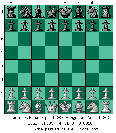 Last move : 0-1 2006 November 3 20:55:17 [Event "FICGS__CHESS__RAPID_B__000016"] [Site "FICGS"] [Date "2006.09.20"] [Round "1"] [White "Pramanik,Ranadeep"] [Black "Agusto,Pat"] [Result "0-1"] [WhiteElo "1700"] [BlackElo "1500"] 0-1 This chess game has been lost on time (started : 2006.09.20 23:24:12) Player Black won this chess game. Follow this game move after move (download)Only sissies Castle. (Rob Sillars) Im Fernschach kannst du während dem Spiel rauchen. (John Christen Knudsen) Diferente gente reacciona diferentemente en aceptar la derrota. (Bobby Fischer) Des combinaisons [dans le jeu d'échecs] pareilles à des mélodies. Je crois entendre pour ainsi dire la musique des coups... (Vladimir Nabokov) The faster the computer, the slower the brain. (Thibault de Vassal)