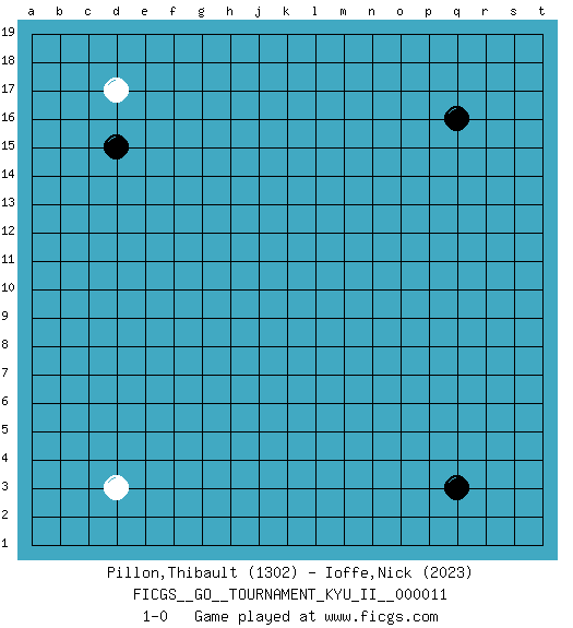 Last move : 1-0 2009 August 24 9:20:32 [Event "FICGS__GO__TOURNAMENT_KYU_II__000011"] [Site "FICGS"] [Date "2009.07.22"] [Round "1"] [Black "Pillon,Thibault"] [White "Ioffe,Nick"] [Result "1-0"] [Rating 1 "1302"] [Rating 2 "2023"] 1.q16 d17 2.q3 d3 3.d15 1-0 This go game has been lost on time (started : 2009.07.22 23:26:52) Here are the names of the openings (joseki) played in the four corners : Corner d16 : d17 d15 Komoku (Somok, Xiao~mu`) 3-4 Point. The komoku (3-4) point is the traditional corner enclosure move.. Ikken Takagakari (Hankan Nop'dakeolch'im, Yi Gaogua`jiao~, 1-Space High Approach). The 5-4 approach move has become more popular in modern times, as modern Go emphasizes speed and influence. Player Black won this Go (weiqi, baduk) game. Follow this game move after move (download)For rectangular six in the corner, dame is necessary. (Anonymous) When I took office, only high energy physicists had ever heard of what is called the World Wide Web... Now even my cat has its own page. (Bill Clinton, 1996)