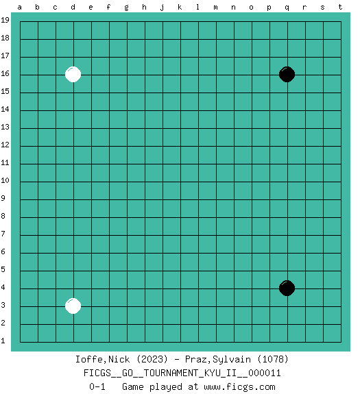 Last move : 0-1 2009 August 24 21:23:12 [Event "FICGS__GO__TOURNAMENT_KYU_II__000011"] [Site "FICGS"] [Date "2009.07.22"] [Round "1"] [Black "Ioffe,Nick"] [White "Praz,Sylvain"] [Result "0-1"] [Rating 1 "2023"] [Rating 2 "1078"] 1.q4 d16 2.q16 d3 0-1 This go game has been lost on time (started : 2009.07.22 23:26:52) Here are the names of the openings (joseki) played in the four corners : Corner d4 : d3 0-1 Komoku (Somok, Xiao~mu`) 3-4 Point. The komoku (3-4) point is the traditional corner enclosure move.. Player White won this Go (weiqi, baduk) game. Follow this game move after move (download)A meijin needs no joseki. (Anonymous) It is not true that people stop pursuing dreams because they grow old, they grow old because they stop pursuing dreams. (Gabriel Garcia Marquez)