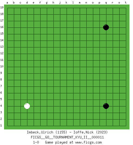 Last move : 1-0 2009 August 25 9:25:31 [Event "FICGS__GO__TOURNAMENT_KYU_II__000011"] [Site "FICGS"] [Date "2009.07.22"] [Round "1"] [Black "Imbeck,Ulrich"] [White "Ioffe,Nick"] [Result "1-0"] [Rating 1 "1155"] [Rating 2 "2023"] 1.q16 d4 2.q4 1-0 This go game has been lost on time (started : 2009.07.22 23:26:52) Here are the names of the openings (joseki) played in the four corners : Corner q4 : q4 1-0 Hoshi (Hwajeom, Seongjeom, Xingwei`) 4-4 Point. The star or hoshi (4-4) point, emphasizing influence at the potential expense of territory. Player Black won this Go (weiqi, baduk) game. Follow this game move after move (download)White is always trying to kill a bigger group than black is trying to save. (Anonymous) A cynic is a man who knows the price of everything but the value of nothing. (Oscar Wilde)