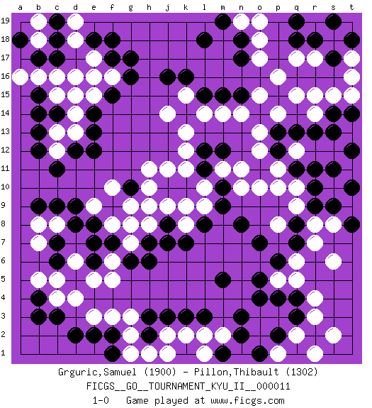 Last move : 1-0 2009 September 1 16:41:10 [Event "FICGS__GO__TOURNAMENT_KYU_II__000011"] [Site "FICGS"] [Date "2009.07.22"] [Round "1"] [Black "Grguric,Samuel"] [White "Pillon,Thibault"] [Result "1-0"] [Rating 1 "1900"] [Rating 2 "1302"] 1.r16 d16 2.q3 p16 3.n17 o15 4.n15 n14 5.m15 r17 6.s17 q17 7.r13 s18 8.s16 q5 9.o4 r3 10.r2 r4 11.r10 r8 12.f17 f16 13.g16 e17 14.f15 e16 15.g17 d4 16.c11 c13 17.c6 g3 18.l3 c8 19.c3 c4 20.b4 b5 21.b3 c5 22.e2 e3 23.f2 f3 24.d8 d6 25.c9 b8 26.b9 d7 27.e8 q10 28.q11 p11 29.p12 q12 30.r11 q9 31.p13 p14 32.c18 d18 33.b15 c15 34.b13 b16 35.c14 d14 36.b14 r14 37.q13 r15 38.c17 c16 39.f18 d19 40.e13 p3 41.p4 q2 42.q4 s2 43.p2 r1 44.o11 m14 45.l15 l14 46.k14 o3 47.n3 o2 48.n2 p1 49.m5 k13 50.h2 g2 51.d2 j2 52.h3 h1 53.j3 k15 54.k16 j14 55.j16 p5 56.o5 k2 57.k3 p10 58.g6 f5 59.s14 s15 60.s13 f8 61.e7 f6 62.e6 e5 63.c7 b7 64.d5 l2 65.f7 g7 66.h7 g8 67.h6 n1 68.b17 a16 69.e14 d13 70.e12 c12 71.b12 o18 72.n18 o12 73.m1 m2 74.o1 l1 75.p2 j1 76.t18 t15 77.r18 t16 78.s19 t17 79.q18 n19 80.m19 o19 81.l18 o17 82.q19 o13 83.q16 n10 84.l11 l10 85.k10 k11 86.m10 l9 87.m9 m11 88.l12 k12 89.r9 s8 90.q8 o10 91.l8 k9 92.j10 j9 93.m12 n11 94.h9 h10 95.g10 h11 96.j8 j11 97.n8 k8 98.k7 h8 99.j7 t11 100.t14 q15 101.t10 s10 102.s11 t9 103.t12 s18 104.s17 g9 105.f9 h9 106.a18 b19 107.d15 e15 108.d12 d15 109.p6 q6 110.s9 d6 111.q7 s6 112.t10 e9 113.d9 f10 114.f1 g1 115.t8 r7 116.o7 p8 117.e18 b18 118.c19 1-0 Here are the names of the openings (joseki) played in the four corners : Corner q16 : r16 p16 Komoku (Somok, Xiao~mu`) 3-4 Point. The komoku (3-4) point is the traditional corner enclosure move.. Ikken Takagakari (Hankan Nop'dakeolch'im, Yi Gaogua`jiao~, 1-Space High Approach). The 5-4 approach move has become more popular in modern times, as modern Go emphasizes speed and influence. Corner q4 : q3 q5 Komoku (Somok, Xiao~mu`) 3-4 Point. The komoku (3-4) point is the traditional corner enclosure move.. Ikken Takagakari (Hankan Nop'dakeolch'im, Yi Gaogua`jiao~, 1-Space High Approach). The 5-4 approach move has become more popular in modern times, as modern Go emphasizes speed and influence. Corner d16 : d16 f17 Hoshi (Hwajeom, Seongjeom, Xingwei`) 4-4 Point. The star or hoshi (4-4) point, emphasizing influence at the potential expense of territory. Ikken Kakari (Hankan Keolch'im, Yi Gua`jiao~, 1-Space Low Approach). Black 2 is the standard approach move to the 4-4. Corner d4 : d4 c6 Hoshi (Hwajeom, Seongjeom, Xingwei`) 4-4 Point. The star or hoshi (4-4) point, emphasizing influence at the potential expense of territory. Ikken Kakari (Hankan Keolch'im, Yi Gua`jiao~, 1-Space Low Approach). Black 2 is the standard approach move to the 4-4. Player Black won this Go (weiqi, baduk) game. Follow this game move after move (download)Proverbs do not apply to White. (Tero Sand) Dave, my mind is going. I can feel it. (HAL 9000 in 2001, a space odyssey)