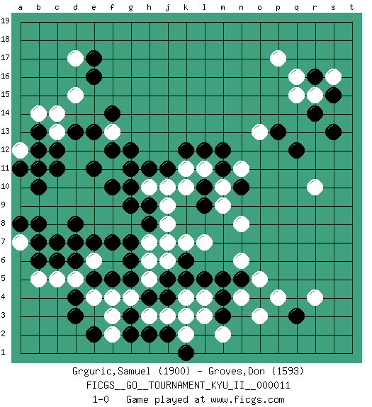 Last move : 1-0 2009 September 3 0:12:0 [Event "FICGS__GO__TOURNAMENT_KYU_II__000011"] [Site "FICGS"] [Date "2009.07.22"] [Round "1"] [Black "Grguric,Samuel"] [White "Groves,Don"] [Result "1-0"] [Rating 1 "1900"] [Rating 2 "1593"] 1.r16 d15 2.q3 d5 3.d3 g4 4.e5 e4 5.d4 e6 6.f5 p17 7.d6 c5 8.c6 q15 9.r14 r15 10.s15 q16 11.g5 b5 12.b6 s16 13.s13 f4 14.h4 h3 15.j4 j3 16.k3 h5 17.g6 k4 18.j5 h6 19.g7 h7 20.k5 g8 21.f7 f8 22.e7 e8 23.d8 l4 24.g3 k2 25.l5 f3 26.g2 f2 27.j2 l3 28.h2 k3 29.e2 d9 30.h8 j8 31.h9 k7 32.j7 j6 33.m5 o3 34.k6 j7 35.o4 j9 36.g10 h10 37.g9 c8 38.d7 e10 39.e9 f9 40.f10 e9 41.g12 e12 42.h11 j10 43.j11 n4 44.n5 p4 45.m4 o5 46.m3 f11 47.g11 k11 48.k12 l11 49.l12 n11 50.m11 m10 51.m12 n8 52.l10 k10 53.l9 l7 54.e13 f13 55.f12 d12 56.e11 c10 57.d13 c13 58.c12 d11 59.c11 f11 60.n10 m9 61.e11 d10 62.b10 f11 63.f14 b9 64.e11 c9 65.b13 c14 66.b11 a12 67.c7 a10 68.b8 a9 69.a8 f11 70.b12 a7 71.b7 m2 72.a11 n6 73.k1 r4 74.p13 b14 75.e11 r10 76.e17 o13 77.q12 d17 78.e16 1-0 Here are the names of the openings (joseki) played in the four corners : Corner d4 : d5 d3 Takamoku (Gomok, Gaomu`) 5-4 Point. The takamoku (high) point (5-4). With its emphasis on influence, the 5-4 point complements the 4-4 (hoshi) point in creating an influence-oriented fuseki. Komoku. White responds with 3-3, 3-5, 4-6, 4-7, 3-6, 3-7. Corner q16 : r16 p17 Komoku (Somok, Xiao~mu`) 3-4 Point. The komoku (3-4) point is the traditional corner enclosure move.. Ikken Kakari (Hankan Keolch'im, Yi Gua`jiao~, 1-Space Low Pincer). The small knight move is the basic approach move to the 3-4 point stone. It has been continually used for over four centuries. There are limitless variations, with new moves constantly being discovered. White 2 opens the door to a treaure store of joseki. Corner q4 : q3 l4 Komoku (Somok, Xiao~mu`) 3-4 Point. The komoku (3-4) point is the traditional corner enclosure move.. Corner d16 : d15 g12 Takamoku (Gomok, Gaomu`) 5-4 Point. The takamoku (high) point (5-4). With its emphasis on influence, the 5-4 point complements the 4-4 (hoshi) point in creating an influence-oriented fuseki. Player Black won this Go (weiqi, baduk) game. Follow this game move after move (download)A few moments to learn, a lifetime to master. (Ancient proverb) A good teacher is like a candle - it consumes itself to light the way for others. (Author unknown)