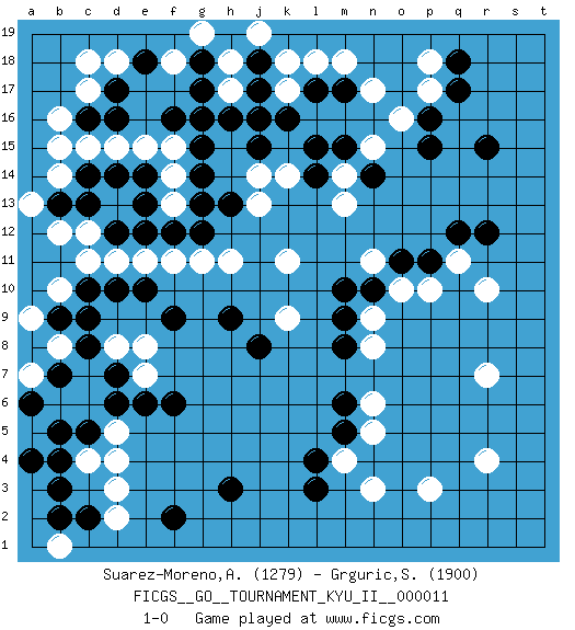 Last move : 1-0 2009 November 1 22:34:25 [Event "FICGS__GO__TOURNAMENT_KYU_II__000011"] [Site "FICGS"] [Date "2009.07.22"] [Round "1"] [Black "Suarez-Moreno,Alejandro"] [White "Grguric,Samuel"] [Result "1-0"] [Rating 1 "1279"] [Rating 2 "1900"] 1.q17 r4 2.r15 d4 3.d16 k17 4.g17 n17 5.l3 p3 6.h3 c7 7.c14 r10 8.c10 e7 9.f2 d3 10.r12 r7 11.p11 c12 12.e10 c17 13.d17 b15 14.b13 d18 15.e18 c18 16.c16 b16 17.e14 h17 18.g16 p17 19.p16 p18 20.q18 o16 21.p15 h18 22.n14 j14 23.h13 n3 24.m5 f11 25.f9 f13 26.g14 h11 27.h9 k11 28.l15 d11 29.d10 b12 30.e12 e11 31.g12 g11 32.f12 k9 33.j8 q11 34.q12 p10 35.o11 d13 36.e13 c15 37.d14 j13 38.j16 o10 39.n10 m4 40.l4 n5 41.m6 n9 42.m9 n8 43.m8 b14 44.c13 a13 45.d12 c11 46.d6 c6 47.d7 d8 48.e6 e8 49.f6 n6 50.l17 l18 51.m17 m18 52.c2 d2 53.b4 c4 54.b3 b1 55.b5 b6 56.c5 d5 57.c8 b8 58.c9 a5 59.a4 a7 60.a6 f15 61.f16 a5 62.b2 b10 63.b9 a9 64.a6 d15 65.b7 e15 66.g15 f14 67.g13 f18 68.j15 m14 69.m15 n15 70.l14 m13 71.k16 n11 72.m10 k14 73.j17 k18 74.j18 j19 75.g18 g19 76.h16 1-0 Here are the names of the openings (joseki) played in the four corners : Corner q4 : r4 l3 Komoku (Somok, Xiao~mu`) 3-4 Point. The komoku (3-4) point is the traditional corner enclosure move.. Corner d4 : d4 h3 Hoshi (Hwajeom, Seongjeom, Xingwei`) 4-4 Point. The star or hoshi (4-4) point, emphasizing influence at the potential expense of territory. Player Black won this Go (weiqi, baduk) game. Follow this game move after move (download)Don't try to enclose an open skirt. (Anonymous) A shortcut is the longest distance between two points. (Don Groves)