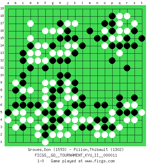 Last move : 1-0 2009 August 8 2:55:4 [Event "FICGS__GO__TOURNAMENT_KYU_II__000011 "] [Site "FICGS"] [Date "2009.07.22"] [Round "1"] [Black "Groves,Don "] [White "Pillon,Thibault "] [Result "1-0"] [Rating 1 "1593"] [Rating 2 "1302"] 1.p16 d4 2.r5 d17 3.d14 f16 4.c10 q3 5.n4 p4 6.q7 r4 7.q5 s4 8.r11 r16 9.d6 f4 10.m16 k17 11.k15 q13 12.p12 k4 13.r15 s15 14.r14 q16 15.s14 q15 16.p17 q17 17.q14 p15 18.p18 r18 19.n6 d12 20.c12 d13 21.c13 e14 22.d11 d15 23.s16 s17 24.t15 q18 25.c3 c4 26.h4 h3 27.j3 j4 28.g3 h2 29.g4 g2 30.f3 e3 31.f2 j2 32.f5 e2 33.l3 l4 34.b6 n3 35.m3 m4 36.o3 n2 37.o4 o2 38.p3 p2 39.b4 f1 40.j16 j17 41.h17 h16 42.h15 g16 43.o15 h5 44.g5 c5 45.c6 b5 46.a5 b3 47.l6 o14 48.p14 o16 49.n15 h13 50.k13 j7 51.k8 k7 52.l7 j8 53.k9 e5 54.e6 f6 55.g6 f7 56.g7 f8 57.j5 h6 58.g8 f9 59.h10 g9 60.h9 c8 61.b8 b9 62.c9 d8 63.c7 a4 64.h8 k5 65.f11 j9 66.j10 s6 67.s5 t5 68.s7 p5 69.o6 r6 70.q6 j14 71.j15 k14 72.g14 g13 73.f13 f14 74.l14 f12 75.g12 e12 76.h12 j13 77.j12 e13 78.k6 k3 79.o17 1-0 Here are the names of the openings (joseki) played in the four corners : Corner d16 : d17 d14Komoku (Somok, Xiao~mu`) 3-4 Point. The komoku (3-4) point is the traditional corner enclosure move..Nikken Takagakari (Dukan Nop'dakeolch'im, E`r Gaojia, 2-Space High Approch). The great master Honinbo Shuei (1852-1906) favored the two-space high (niken taka-gakari) approach, especially in two stone handicap games. This approach move was very popular in the 1910s. Wu Qingyuan = Go Seigen frequently played this way, considering it a good "whole board" approach. In recent years, O Rissei has often used the two-space high approach. Corner q4 : r5 q3Mokuhazushi (Waemok, Wai`mu`) 5-3 Point. The mokuhazushi (5-3) point was popular in the Edo period in Japan (1600 - 1867). It emphasizes influence; territorially, it is inferior to the 3-4 point.Komoku Kakari. White 2 is the standard approach because of its solidity and stability. Corner d4 : d4 d6Hoshi (Hwajeom, Seongjeom, Xingwei`) 4-4 Point. The star or hoshi (4-4) point, emphasizing influence at the potential expense of territory.Ikken Takagakari (Hankan Nop'dakeolch'im, Yi Gaojia, 1-Space High Approach). White typically responds at 6-4 or 3-10. White 4-10 is played when White finds play on the right side advantageous. White 4-8 or 3-8 may be played when White has support at top. Player Black won this Go (weiqi, baduk) game.Follow this game move after move (download ) Sacrifice for shape. (Anonymous) Nowadays, anyone who cannot speak English and is incapable of using the Internet is regarded as backward. (Al-Waleed bin Talal)