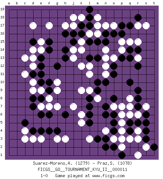 Last move : 1-0 2009 August 5 21:16:53 [Event "FICGS__GO__TOURNAMENT_KYU_II__000011"] [Site "FICGS"] [Date "2009.07.22"] [Round "1"] [Black "Suarez-Moreno,Alejandro"] [White "Praz,Sylvain"] [Result "1-0"] [Rating 1 "1279"] [Rating 2 "1078"] 1.q17 c4 2.q4 d17 3.e4 e3 4.d4 d3 5.c5 c3 6.f4 g3 7.g4 h3 8.d7 d10 9.d15 d13 10.f15 f17 11.h16 h17 12.j16 j17 13.e12 d12 14.e10 d9 15.d11 c11 16.e11 c13 17.e13 e9 18.f9 e7 19.e6 f7 20.f6 g7 21.e8 f8 22.d8 g9 23.f10 g10 24.n3 e14 25.f14 d14 26.g12 e15 27.n16 q15 28.q13 o17 29.p16 m17 30.o16 n17 31.q10 r13 32.r12 r17 33.r18 p14 34.r14 n14 35.l15 m16 36.m15 r15 37.q14 p15 38.p13 o13 39.o12 n12 40.o11 n11 41.n10 l11 42.m10 k12 43.l13 l12 44.m13 n13 45.n15 k9 46.l8 l9 47.m9 m8 48.l7 j7 49.h6 k6 50.l6 k5 51.l5 l3 52.m3 r6 53.r5 q6 54.r8 r3 55.s5 q3 56.s3 r4 57.s4 p4 58.q5 o3 59.o2 p2 60.o4 p3 61.n2 n4 62.o5 p5 63.s6 q8 64.r7 q7 65.o6 p6 66.o8 s7 67.r9 s2 68.t2 r1 69.p1 o7 70.n7 p7 71.n6 j14 72.h14 k15 73.k16 j13 74.h13 l16 75.j15 k14 76.p17 s17 77.k17 k18 78.l18 j18 79.l17 m18 80.l19 1-0 Here are the names of the openings (joseki) played in the four corners : Corner d4 : c4 e4 Komoku (Somok, Xiao~mu`) 3-4 Point. The komoku (3-4) point is the traditional corner enclosure move.. Ikken Takagakari (Hankan Nop'dakeolch'im, Yi Gaogua`jiao~, 1-Space High Approach). The 5-4 approach move has become more popular in modern times, as modern Go emphasizes speed and influence. Corner d16 : d17 d15 Komoku (Somok, Xiao~mu`) 3-4 Point. The komoku (3-4) point is the traditional corner enclosure move.. Ikken Takagakari (Hankan Nop'dakeolch'im, Yi Gaogua`jiao~, 1-Space High Approach). The 5-4 approach move has become more popular in modern times, as modern Go emphasizes speed and influence. Player Black won this Go (weiqi, baduk) game. Follow this game move after move (download)Play slow, win slow; play fast, lose fast. (Anonymous) There are 10 types of people in this world: those who understand binary and those who don't. (Anonymous)