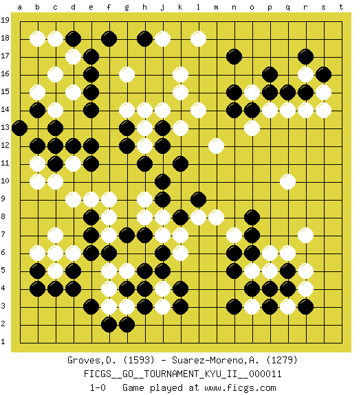Last move : 1-0 2009 September 4 5:6:8 [Event "FICGS__GO__TOURNAMENT_KYU_II__000011"] [Site "FICGS"] [Date "2009.07.22"] [Round "1"] [Black "Groves,Don"] [White "Suarez-Moreno,Alejandro"] [Result "1-0"] [Rating 1 "1593"] [Rating 2 "1279"] 1.p16 q14 2.d4 r16 3.e16 k16 4.q5 c16 5.o14 o15 6.p15 p14 7.n15 o13 8.n14 g16 9.e14 c14 10.k14 g14 11.e12 c12 12.g12 j14 13.j13 k15 14.q15 r14 15.r15 s15 16.s16 s14 17.r17 q10 18.k4 d9 19.c11 d11 20.d12 c10 21.c13 b11 22.b12 b13 23.c11 d17 24.c12 c7 25.e7 c5 26.e17 d15 27.e15 h13 28.j12 h12 29.h11 j11 30.g13 h14 31.k11 k13 32.j10 l14 33.c4 d6 34.e6 n7 35.o8 r7 36.o7 p6 37.o6 p5 38.p4 o5 39.n6 q6 40.n3 g3 41.e3 o3 42.o4 r4 43.n5 q3 44.p3 m12 45.b5 b6 46.d5 c6 47.b4 b10 48.b14 b15 49.a13 b18 50.d18 c18 51.f18 j3 52.k3 f5 53.h5 f9 54.g7 h9 55.q4 r5 56.r3 f8 57.e8 e9 58.j9 h8 59.h7 j8 60.k8 j7 61.j6 k7 62.e11 k6 63.g4 f3 64.f2 f4 65.h3 j4 66.j5 g5 67.h4 f7 68.f6 l8 69.l9 m8 70.n17 l18 71.h18 j18 72.g2 1-0 Here are the names of the openings (joseki) played in the four corners : Corner q16 : p16 q14 Takamoku (Gomok, Gaomu`) 5-4 Point. The takamoku (high) point (5-4). With its emphasis on influence, the 5-4 point complements the 4-4 (hoshi) point in creating an influence-oriented fuseki. Corner d16 : e16 c16 Takamoku (Gomok, Gaomu`) 5-4 Point. The takamoku (high) point (5-4). With its emphasis on influence, the 5-4 point complements the 4-4 (hoshi) point in creating an influence-oriented fuseki. Komoku. Black responds with 3-3, 3-5, 4-6, 4-7, 3-6, 3-7. Corner d4 : d4 d9 Hoshi (Hwajeom, Seongjeom, Xingwei`) 4-4 Point. The star or hoshi (4-4) point, emphasizing influence at the potential expense of territory. Corner q4 : q5 n7 Takamoku (Gomok, Gaomu`) 5-4 Point. The takamoku (high) point (5-4). With its emphasis on influence, the 5-4 point complements the 4-4 (hoshi) point in creating an influence-oriented fuseki. Player Black won this Go (weiqi, baduk) game. Follow this game move after move (download)Beware of the clumsy double contact. (Anonymous) All politicians must be presumed guilty until they are proven innocent. (Dinesh De Silva)