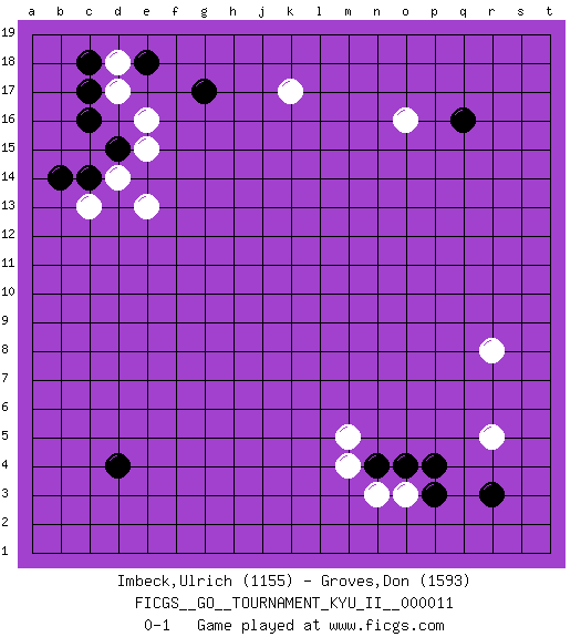 Last move : 0-1 2009 August 3 1:10:35 [Event "FICGS__GO__TOURNAMENT_KYU_II__000011 "] [Site "FICGS"] [Date "2009.07.22"] [Round "1"] [Black "Imbeck,Ulrich "] [White "Groves,Don "] [Result "0-1"] [Rating 1 "1155"] [Rating 2 "1593"] 1.q16 r5 2.d4 e16 3.p3 n3 4.r3 r8 5.c16 d14 6.c14 c13 7.d15 e15 8.b14 e13 9.n4 o3 10.o4 m4 11.p4 m5 12.g17 k17 13.e18 d17 14.c17 d18 15.c18 o16 0-1 Here are the names of the openings (joseki) played in the four corners : Corner q4 : r5 p3Mokuhazushi (Waemok, Wai`mu`) 5-3 Point. The mokuhazushi (5-3) point was popular in the Edo period in Japan (1600 - 1867). It emphasizes influence; territorially, it is inferior to the 3-4 point. Corner d16 : e16 c16Takamoku (Gomok, Gaomu`) 5-4 Point. The takamoku (high) point (5-4). With its emphasis on influence, the 5-4 point complements the 4-4 (hoshi) point in creating an influence-oriented fuseki.Komoku. White responds with 3-3, 3-5, 4-6, 4-7, 3-6, 3-7. Corner q16 : q16 o16Hoshi (Hwajeom, Seongjeom, Xingwei`) 4-4 Point. The star or hoshi (4-4) point, emphasizing influence at the potential expense of territory.Ikken Takagakari (Hankan Nop'dakeolch'im, Yi Gaojia, 1-Space High Approach). Black typically responds at 6-4 or 3-10. Black 4-10 is played when Black finds play on the right side advantageous. Black 4-8 or 3-8 may be played when Black has support at top. Player White won this Go (weiqi, baduk) game.Follow this game move after move (download ) With only one group, you will win. (Anonymous) God is an atheist. (Unknown)