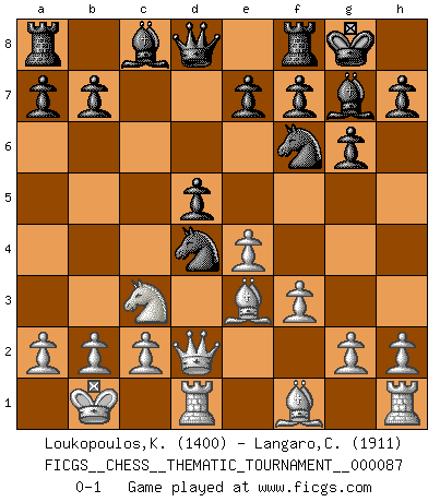 Last move : 0-1 2009 September 25 9:53:44 [Event "FICGS__CHESS__THEMATIC_TOURNAMENT__000087"] [Site "FICGS"] [Date "2009.07.23"] [Round "1"] [White "Loukopoulos,Klearchos"] [Black "Langaro,Caetano"] [Result "0-1"] [WhiteElo "1400"] [BlackElo "1911"] 1.e4 c5 2.Nf3 d6 3.d4 cxd4 4.Nxd4 Nf6 5.Nc3 g6 6.Be3 Bg7 7.f3 Nc6 8.Qd2 O-O 9.O-O-O d5 10.Kb1 Nxd4 0-1 Sicilian : Dragon, Yugoslav attack Kingside Castling by player Black (move 8) Queenside Castling by player White (move 9) Player Black won this chess game. Follow this game move after move (download)Play the opening like a book, the middle game like a magician, and the endgame like a machine. (Spielmann) Die Partien sind immer verschieden, die Interviews immer die gleichen. (Garry Kasparov) El hombre es un frívolo, una creatura engañosa y como un jugador de Ajedrez, se preocupa mas por el proceso de obtener su meta que de la meta por sí misma. (Dostoyevsky) Si je n'étais pas joueur d'échecs, je serais le meilleur dans quelque chose d'autre. (Anatoli Karpov) I'm extremely disappointed. I send you out for exciting, new designer drugs, you come back with tomato sauce. (Gregory House, House M.D.)