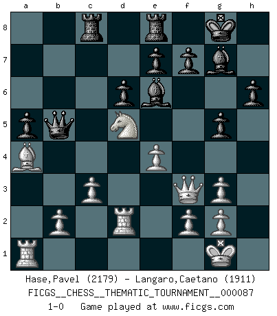 Last move : 1-0 2009 November 17 21:50:7 [Event "FICGS__CHESS__THEMATIC_TOURNAMENT__000087"] [Site "FICGS"] [Date "2009.07.23"] [Round "1"] [White "Hase,Pavel"] [Black "Langaro,Caetano"] [Result "1-0"] [WhiteElo "2179"] [BlackElo "1911"] 1.e4 c5 2.Nf3 d6 3.d4 cxd4 4.Nxd4 Nf6 5.Nc3 g6 6.Bc4 Bg7 7.O-O O-O 8.Re1 Nc6 9.Bb3 Bd7 10.Bg5 h6 11.Bh4 Nxd4 12.Qxd4 g5 13.Bg3 Nh5 14.Qe3 Nxg3 15.hxg3 Qa5 16.Red1 Rac8 17.Nd5 Rfe8 18.c3 Qc5 19.Qf3 a5 20.a4 Be6 21.Rd2 b5 22.axb5 Qxb5 23.Ba4 1-0 Sicilian : Dragon variation Kingside Castling by player White (move 7) Kingside Castling by player Black (move 7) Player White won this chess game. Follow this game move after move (download)Methodical thinking is of more use in Chess than inspiration. (C. J. S. Purdy) Nur ein wirklich starker Spieler weiß wie schwach er spielt. (Savielly Grigorievitsch Tartakower) Con el fin de mejorar tu juego, debes de estudiar los finales antes que todo, ya que mientras que los finales pueden ser estudiados y dominados por sí mismos, el juegomedio y la apertura deben de ser estudiados en relación con los finales. (José Raúl Capablanca) C'est la seule position que je connaisse où les deux camps sont mals. Propos prêtés à V. Anand. A clear conscience is usually the sign of a bad memory. (Unknown)