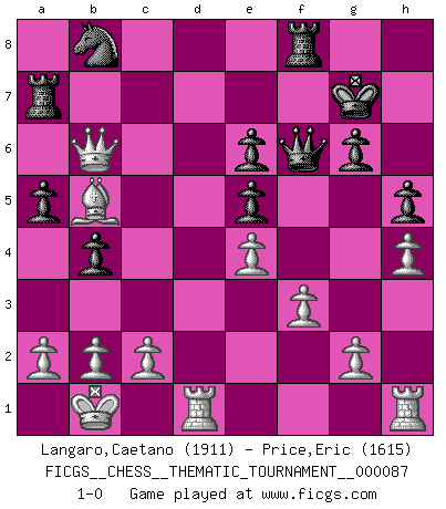 Last move : 1-0 2009 September 28 0:51:45 [Event "FICGS__CHESS__THEMATIC_TOURNAMENT__000087"] [Site "FICGS"] [Date "2009.07.23"] [Round "1"] [White "Langaro,Caetano"] [Black "Price,Eric"] [Result "1-0"] [WhiteElo "1911"] [BlackElo "1615"] 1.e4 c5 2.Nf3 d6 3.d4 cxd4 4.Nxd4 Nf6 5.Nc3 g6 6.Be3 Bg7 7.f3 O-O 8.Qd2 a6 9.O-O-O b5 10.h4 h5 11.Bh6 e5 12.Bxg7 Kxg7 13.Nb3 b4 14.Nd5 a5 15.Nxf6 Qxf6 16.Qxd6 Qf4+ 17.Kb1 Be6 18.Bb5 Ra7 19.Nc5 Qf6 20.Nxe6+ fxe6 21.Qb6 1-0 Sicilian : Dragon, Yugoslav attack, 7...O-O Kingside Castling by player Black (move 7) Queenside Castling by player White (move 9) Player White won this chess game. Follow this game move after move (download)A great player and a great example for many. His book My 60 Memorable Games had a big impact on me. It is a shame he didn't continue to enrich the world of chess with his unparalleled understanding after 1972. (Jan Timman, about Bobby Fischer's death) Karpov ist ein Museumsstück. (Garry Kasparov) Una compensación adecuada por un sacrificio es tener una combinación sólida que conduce a una posición ganadora; una compensación adecuada por una metida de pata es dejar a tu oponente arrebatar una derrota de las fauces de la victoria. (Bruce A. Moon) La tactique, c'est ce que vous faites quand il y a quelque chose à faire; la stratégie, c'est ce que vous faites quand il n'y a rien à faire. (Savielli Tartacower) Life is like a play: it's not the length but the excellence of the acting that matters. (Seneca)