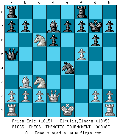 Last move : 1-0 2009 October 17 9:20:43 [Event "FICGS__CHESS__THEMATIC_TOURNAMENT__000087"] [Site "FICGS"] [Date "2009.07.23"] [Round "1"] [White "Price,Eric"] [Black "Cirulis,Ilmars"] [Result "1-0"] [WhiteElo "1615"] [BlackElo "1905"] 1.e4 c5 2.Nf3 d6 3.d4 cxd4 4.Nxd4 Nf6 5.Nc3 g6 6.Be3 Bg7 7.f3 Nc6 8.Qd2 O-O 9.Bc4 Ne5 10.Bb3 Qa5 11.Bh6 Bd7 12.Bxg7 Kxg7 13.f4 Nc6 14.f5 Nxe4 15.Nxc6 1-0 This chess game has been lost on time (started : 2009.07.23 1:11:58) Sicilian : Dragon, Yugoslav attack Kingside Castling by player Black (move 8) Player White won this chess game. Follow this game move after move (download)Only sissies Castle. (Rob Sillars) Besser ein falscher Plan, logisch durchgeführt, als gar kein Plan. (Viktor Kortschnoi) La única cosa que los jugadores de Ajedrez tienen en común, es el Ajedrez. (Lodewijk Prins) Il (Jacob Murray) ne joue pas pour le bon coup, mais pour le meilleur. (Eloi Relange) It is not titles that honor men, but men that honor titles. (Niccolo Machiavelli)