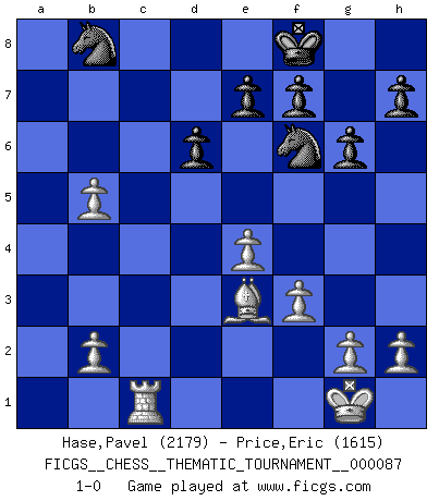 Last move : 1-0 2009 July 29 0:46:9 [Event "FICGS__CHESS__THEMATIC_TOURNAMENT__000087"] [Site "FICGS"] [Date "2009.07.23"] [Round "1"] [White "Hase,Pavel"] [Black "Price,Eric"] [Result "1-0"] [WhiteElo "2179"] [BlackElo "1615"] 1.e4 c5 2.Nf3 d6 3.d4 cxd4 4.Nxd4 Nf6 5.Nc3 g6 6.Bc4 a6 7.O-O b5 8.Bb3 b4 9.Nd5 Bg7 10.Ba4+ Bd7 11.Bxd7+ Qxd7 12.Nb6 Qb7 13.Nxa8 Qxa8 14.f3 O-O 15.a3 Qa7 16.Be3 Nc6 17.axb4 Nxb4 18.c3 Nc6 19.Qa4 Nb8 20.Nf5 Qb7 21.Nxg7 Kxg7 22.Rfb1 Qb5 23.Qxb5 axb5 24.Ra5 b4 25.cxb4 Nc6 26.Rb5 Ra8 27.Rb7 Rb8 28.Rxb8 Nxb8 29.b5 Kf8 30.Rc1 1-0 Sicilian : Dragon variation Kingside Castling by player White (move 7) Kingside Castling by player Black (move 14) Player White won this chess game. Follow this game move after move (download)Chess teaches you to control the initial excitement you feel when you see something that looks good and it trains you to think objectively when you're in trouble. (Stanley Kubrick) Capablanka war das größte Genie der Schachgeschichte! Aber denken sie nicht er habe nichts vom Schach verstanden. Er wusste nur soviel wie er wissen musste um seine Ziele zu erreichen. (Mikhail Moiseyevich Botvinik) El ganador de una partida es aquel jugador que hace el penúltimo error. (Savielly Tartakover) La menace est plus forte que l'exécution. (Aaron Nimzovitch) Those parts of the system that you can hit with a hammer (not advised) are called hardware; those program instructions that you can only curse at are called software. (Anonymous)