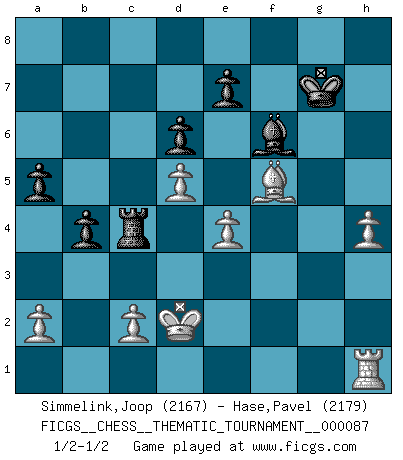 Last move : 1/2-1/2 2009 August 14 21:10:35 [Event "FICGS__CHESS__THEMATIC_TOURNAMENT__000087"] [Site "FICGS"] [Date "2009.07.23"] [Round "1"] [White "Simmelink,Joop"] [Black "Hase,Pavel"] [Result "1/2-1/2"] [WhiteElo "2167"] [BlackElo "2179"] 1.e4 c5 2.Nf3 d6 3.d4 cxd4 4.Nxd4 Nf6 5.Nc3 g6 6.Be3 Bg7 7.f3 O-O 8.Qd2 Nc6 9.Bc4 Bd7 10.O-O-O a6 11.h4 Rc8 12.Bb3 h5 13.Nxc6 Bxc6 14.g4 b5 15.Bg5 b4 16.Nd5 Bxd5 17.exd5 a5 18.Ba4 Rc5 19.Bxf6 Bxf6 20.gxh5 Qc8 21.Rdg1 Qf5 22.hxg6 Qe5 23.gxf7+ Kxf7 24.Qd3 Qxb2+ 25.Kd2 Rg8 26.Qe4 Qe5 27.Rxg8 Qxe4 28.fxe4 Kxg8 29.Be8 Rc4 30.Bg6 Kg7 31.Bf5 1/2-1/2 Sicilian : Dragon, Yugoslav attack, 7...O-O Kingside Castling by player Black (move 7) Queenside Castling by player White (move 10) This chess game ended in a draw. Follow this game move after move (download)Chess is war over the board. The object is to crush the opponents mind. (Bobby Fischer) Ein Remis kann durch Wiederholung von drei Zügen oder durch einen schlechte Zug erreicht werden. (Savielly Grigorievitsch Tartakower) Debemos de asegurarnos de que el Ajedrez no se convierta en un lenguaje muerto, muy interesante, pero solo para un grupo muy pequeño. (Sytze Faber) Il vaut mieux sacrifier les pièces de l'adversaire. (Xavier Tartacover) Be who you are, and say what you feel because those who mind don't matter, and those who matter don't mind. (Dr Seuss)