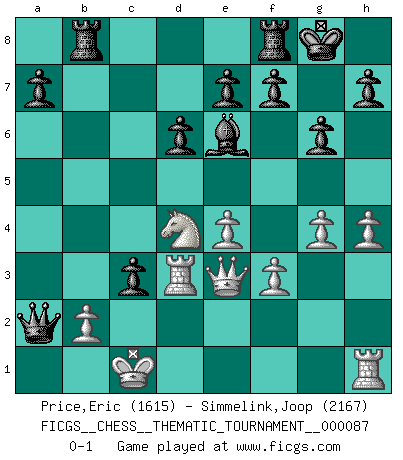 Last move : 0-1 2009 July 29 9:54:59 [Event "FICGS__CHESS__THEMATIC_TOURNAMENT__000087"] [Site "FICGS"] [Date "2009.07.23"] [Round "1"] [White "Price,Eric"] [Black "Simmelink,Joop"] [Result "0-1"] [WhiteElo "1615"] [BlackElo "2167"] 1.e4 c5 2.Nf3 d6 3.d4 cxd4 4.Nxd4 Nf6 5.Nc3 g6 6.Be3 Bg7 7.f3 Nc6 8.Qd2 O-O 9.Bc4 Bd7 10.O-O-O Rb8 11.Bb3 Na5 12.g4 b5 13.Bh6 Bxh6 14.Qxh6 Nxb3+ 15.Nxb3 b4 16.Nd5 Nxd5 17.Rxd5 Be6 18.Rd3 Qc7 19.c3 Qc4 20.Qe3 Qa6 21.h4 Qxa2 22.Nd4 bxc3 0-1 Sicilian : Dragon, Yugoslav attack Kingside Castling by player Black (move 8) Queenside Castling by player White (move 10) Player Black won this chess game. Follow this game move after move (download)Life is like a game of Chess, changing with each move. (Chinese proverb) Die Leute spielen gegen mich seit 15 Jahren unter Ihren Möglichkeiten. (Robert James Fischer) Yo no le temo a Spassky. Todos saben que yo soy el mejor. Uno no necesita un torneo para probarlo. (Bobby Fischer) Echiquier : carré parfait, comme la Jérusalem nouvelle décrite par l'auteur de l'Apocalypse, huit cases sur huit, exaltation du chiffre 4, symbole du cosmos aux quatre horizons... où le noir et le blanc, l'ombre et la lumière, le mal et le bien s'entremêlent et se conjuguent. (Robert Couffignal, Le Gambit du poète) For peace of mind, resign as general manager of the universe. (Douglas Adams)