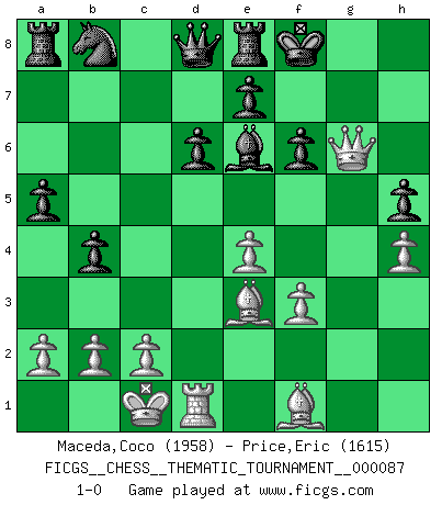 Last move : 1-0 2009 August 31 19:56:24 [Event "FICGS__CHESS__THEMATIC_TOURNAMENT__000087"] [Site "FICGS"] [Date "2009.07.23"] [Round "1"] [White "Maceda,Coco"] [Black "Price,Eric"] [Result "1-0"] [WhiteElo "1958"] [BlackElo "1615"] 1.e4 c5 2.Nf3 d6 3.d4 cxd4 4.Nxd4 Nf6 5.Nc3 g6 6.Be3 Bg7 7.f3 a6 8.Qd2 O-O 9.O-O-O b5 10.g4 b4 11.Nce2 a5 12.h4 h5 13.Ng3 Re8 14.gxh5 Nxh5 15.Nxh5 gxh5 16.Rg1 Kh7 17.Rxg7+ Kxg7 18.Ne6+ Bxe6 19.Bd4+ f6 20.Qg5+ Kf8 21.Qh6+ Kg8 22.Qg6+ Kf8 23.Be3 1-0 Sicilian : Dragon, Yugoslav attack Kingside Castling by player Black (move 8) Queenside Castling by player White (move 9) Player White won this chess game. Follow this game move after move (download)The stomach is an essential part of the Chess master. (Bent Larsen) Eine Person mit durchschnittlichem IQ kann etwa eine ELO von 2000 erreichen. (Jonathan Levitt) No es suficiente ser un buen jugador, se debe también de jugar bién. (Siegbert Tarrasch) Demandez au pauvre Cg1 ce qu'il en pense. Eduard Gufeld à propos de la variante Saemisch de l'Est-Indienne. Thibault, I ask for draw. Game 13876. - Sorry Ilmars, you won. (FICGS chat)