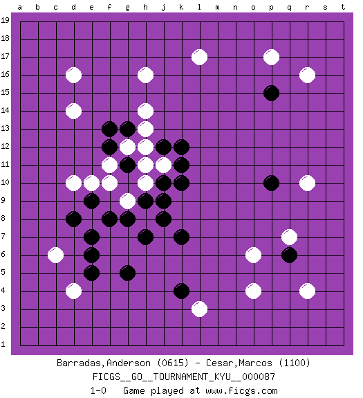 Last move : 1-0 2009 September 20 22:44:26 [Event "FICGS__GO__TOURNAMENT_KYU__000087 "] [Site "FICGS"] [Date "2009.07.24"] [Round "1"] [Black "Barradas,Anderson "] [White "Cesar,Marcos "] [Result "1-0"] [Rating 1 "0615"] [Rating 2 "1100"] 1.p15 d4 2.e6 r4 3.q6 r16 4.p10 r10 5.k4 d16 6.g5 d10 7.d8 f10 8.g10 g9 9.h9 h10 10.g11 h8 11.j9 f11 12.f12 g12 13.h11 h12 14.j10 j11 15.j12 h10 16.k10 o4 17.k11 l3 18.g11 h11 19.g13 h13 20.k12 l17 21.f13 h14 22.g8 o6 23.h7 q7 24.j8 p17 25.k7 c6 26.f8 d14 27.e9 e10 28.e7 h16 29.e5 1-0 This go game has been lost on time (started : 2009.07.24 12:19:34) Here are the names of the openings (joseki) played in the four corners : Corner d4 : d4 e6Hoshi (Hwajeom, Seongjeom, Xingwei`) 4-4 Point. The star or hoshi (4-4) point, emphasizing influence at the potential expense of territory. Corner q4 : r4 q6Komoku (Somok, Xiao~mu`) 3-4 Point. The komoku (3-4) point is the traditional corner enclosure move.. Corner q16 : p15 r16Go-no-go (Wu~wu~) 5-5 Point. The 5-5 was experimented with briefly during the "New Fuseki" movement in Japan in the 1930s. The 5-5 point has not retained popularity because the 4-4 hoshi (star) point strikes a better balance between influence and territory. As one can see from the variations, though, the 5-5 is playable.Komoku. Black continues with 3-5, 4-3 or 3-6. Corner d16 : d16 g11Hoshi (Hwajeom, Seongjeom, Xingwei`) 4-4 Point. The star or hoshi (4-4) point, emphasizing influence at the potential expense of territory. Player Black won this Go (weiqi, baduk) game.Follow this game move after move (download ) A basic: Don't push too hard. (Jansteen) I would love to change the world, but they won't give me the source code. (Unknown)