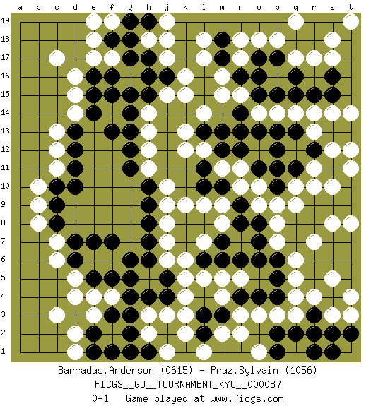 Last move : 0-1 2009 September 26 2:57:31 [Event "FICGS__GO__TOURNAMENT_KYU__000087"] [Site "FICGS"] [Date "2009.07.24"] [Round "1"] [Black "Barradas,Anderson"] [White "Praz,Sylvain"] [Result "0-1"] [Rating 1 "0615"] [Rating 2 "1056"] 1.q15 d4 2.e5 d16 3.e15 q4 4.d10 k4 5.j4 k5 6.j5 j6 7.h6 j7 8.h7 j8 9.h8 q10 10.l10 j10 11.h9 j9 12.h10 h11 13.g11 h12 14.g12 h13 15.g13 h14 16.g14 p14 17.p13 q14 18.p12 n11 19.n12 m11 20.l11 l12 21.m12 k12 22.o11 m9 23.m10 n10 24.n9 o10 25.p10 o9 26.n8 p9 27.p11 l9 28.n13 d15 29.f15 c12 30.d12 c11 31.d11 c13 32.d13 d14 33.e14 d5 34.d6 c6 35.d7 c7 36.c8 e6 37.e7 f6 38.f5 f4 39.g5 e4 40.g6 b8 41.c9 b9 42.g4 c3 43.c10 b10 44.f7 f17 45.e16 e17 46.g17 c17 47.g18 m15 48.l13 k13 49.o8 p8 50.o7 p7 51.o6 o3 52.p6 q6 53.p5 q5 54.q7 r7 55.q8 q9 56.r8 s8 57.r9 r10 58.s9 s10 59.p15 o14 60.n14 n15 61.o15 l14 62.o13 r13 63.m13 k15 64.r12 s12 65.q13 r14 66.q11 r11 67.t9 t8 68.f18 e18 69.s13 s14 70.t13 t14 71.n16 m16 72.m17 n17 73.o16 l17 74.m18 n18 75.h15 j15 76.h16 l18 77.f16 q17 78.m7 n5 79.n6 m5 80.l8 k9 81.h4 j3 82.j2 h3 83.g3 f2 84.g2 k2 85.f3 e3 86.e2 d2 87.f1 h2 88.h1 j1 89.g1 j17 90.h17 j18 91.j16 k16 92.g15 d1 93.e1 h18 94.p4 p3 95.m6 f19 96.g19 e19 97.r15 s17 98.s15 t12 99.k7 k6 100.l6 l5 101.k8 m8 102.l3 k3 103.h19 j19 104.n4 q3 105.o4 n3 106.m3 m4 107.l2 n2 108.m1 l7 109.f13 pass 110.p17 p18 111.o17 o18 112.q16 r17 113.q18 pass 114.r18 s18 115.s19 pass 116.s16 q19 117.r19 t19 118.t10 t11 119.n1 o1 120.r3 s3 121.s4 r4 122.s2 t3 123.r2 s5 124.t2 t4 125.s1 pass 126.q2 q1 127.p2 m2 128.p1 l1 129.r1 pass 0-1 Here are the names of the openings (joseki) played in the four corners : Corner d4 : d4 e5 Hoshi (Hwajeom, Seongjeom, Xingwei`) 4-4 Point. The star or hoshi (4-4) point, emphasizing influence at the potential expense of territory. Corner d16 : d16 e15 Hoshi (Hwajeom, Seongjeom, Xingwei`) 4-4 Point. The star or hoshi (4-4) point, emphasizing influence at the potential expense of territory. Corner q16 : q15 p14 Takamoku (Gomok, Gaomu`) 5-4 Point. The takamoku (high) point (5-4). With its emphasis on influence, the 5-4 point complements the 4-4 (hoshi) point in creating an influence-oriented fuseki. Player White won this Go (weiqi, baduk) game. Follow this game move after move (download)Those who are good at winning, don't usually fight. (Zhang) Every vice is only an exaggeration of a necessary and virtuous function. (Ralph Waldo Emerson, Journals 1936)