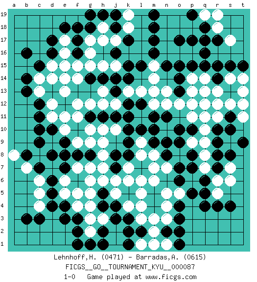 Last move : 1-0 2009 September 16 1:46:11 [Event "FICGS__GO__TOURNAMENT_KYU__000087"] [Site "FICGS"] [Date "2009.07.24"] [Round "1"] [Black "Lehnhoff,Heinz-Georg"] [White "Barradas,Anderson"] [Result "1-0"] [Rating 1 "0471"] [Rating 2 "0615"] 1.d4 e5 2.d5 e6 3.f3 f4 4.e3 g4 5.e4 f5 6.j8 h6 7.g8 g7 8.f8 f7 9.e7 g6 10.h5 j5 11.h4 h3 12.j4 k4 13.j3 j2 14.h2 g3 15.k5 j6 16.k3 l4 17.k2 j1 18.h1 l5 19.k6 k7 20.k1 l6 21.d6 g2 22.f2 g5 23.j7 k6 24.k8 l3 25.l2 m2 26.g1 m1 27.q4 l1 28.f1 l8 29.m9 l9 30.l10 m8 31.n8 n7 32.n9 m7 33.o7 m6 34.o6 o5 35.p5 n5 36.o4 n4 37.o3 n3 38.n2 m3 39.o2 n1 40.o1 h8 41.k9 h9 42.h11 h7 43.k10 g9 44.e9 e10 45.f10 d9 46.d8 f11 47.d10 e11 48.c9 f9 49.e8 g10 50.g11 d11 51.c10 j10 52.j11 h10 53.k11 g12 54.g14 h12 55.j13 j12 56.k12 h13 57.h14 f12 58.c12 d12 59.c11 c13 60.p17 k13 61.j14 l13 62.r15 m13 63.o13 n13 64.m16 n12 65.m10 o12 66.q12 p12 67.q11 p11 68.p10 p13 69.o14 p14 70.o15 o16 71.p15 p16 72.q16 n16 73.n15 m15 74.l15 m14 75.o17 n17 76.m17 n18 77.m18 q14 78.q15 o18 79.r14 r13 80.q17 n19 81.o10 q10 82.r10 q9 83.r9 q8 84.r8 q7 85.r7 r6 86.q6 r5 87.r4 s6 88.s4 s7 89.d16 r11 90.s11 r12 91.s8 q13 92.s13 s12 93.s10 s14 94.t12 t13 95.t15 t11 96.t9 t14 97.q11 q12 98.s15 t12 99.q5 p18 100.q18 q19 101.p19 r19 102.e15 r18 103.r17 s17 104.m19 o19 105.p19 f14 106.c15 f15 107.f16 g15 108.k15 j15 109.k14 g16 110.b13 c14 111.b14 e14 112.f17 g17 113.g18 h18 114.f18 d14 115.n11 e13 116.j16 h15 117.j18 j17 118.k17 h17 119.h19 k18 120.j19 k19 121.g19 d15 122.p8 p9 123.l12 m12 124.o9 e16 125.d17 e17 126.e18 e15 127.b16 c4 128.c3 c5 129.b3 c6 130.c7 b7 131.b8 a8 132.p7 q11 133.m11 1-0 Here are the names of the openings (joseki) played in the four corners : Corner d4 : d4 e5 Hoshi (Hwajeom, Seongjeom, Xingwei`) 4-4 Point. The star or hoshi (4-4) point, emphasizing influence at the potential expense of territory. Corner d16 : h11 f11 This joseki is unknown. A weak or weird move has probably been played in this corner. Corner q16 : p17 l13 Mokuhazushi (Waemok, Wai`mu`) 5-3 Point. The mokuhazushi (5-3) point was popular in the Edo period in Japan (1600 - 1867). It emphasizes influence; territorially, it is inferior to the 3-4 point. Player Black won this Go (weiqi, baduk) game. Follow this game move after move (download)Don't make dango's. (Anonymous) When the going gets tactical, the computers get going. (Hyatt)