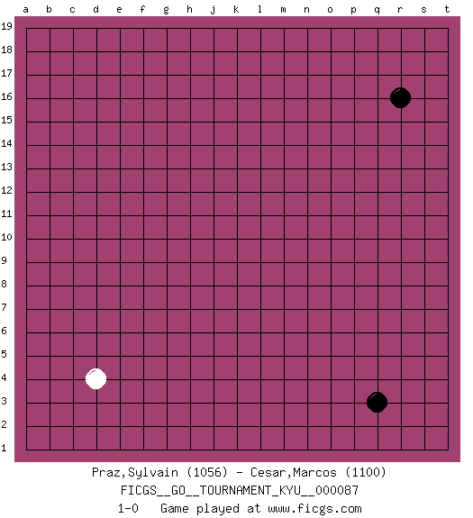 Last move : 1-0 2009 August 26 21:31:27 [Event "FICGS__GO__TOURNAMENT_KYU__000087"] [Site "FICGS"] [Date "2009.07.24"] [Round "1"] [Black "Praz,Sylvain"] [White "Cesar,Marcos"] [Result "1-0"] [Rating 1 "1056"] [Rating 2 "1100"] 1.r16 d4 2.q3 1-0 This go game has been lost on time (started : 2009.07.24 12:19:34) Here are the names of the openings (joseki) played in the four corners : Corner q4 : q3 1-0 Komoku (Somok, Xiao~mu`) 3-4 Point. The komoku (3-4) point is the traditional corner enclosure move.. Player Black won this Go (weiqi, baduk) game. Follow this game move after move (download)... {it is} something unearthly... if there are sentient beings on other planets, then they play go. (Emanuel Lasker, chess world champion) Wipe them out. All of them. (Darth Sidious in Star Wars ep.1)