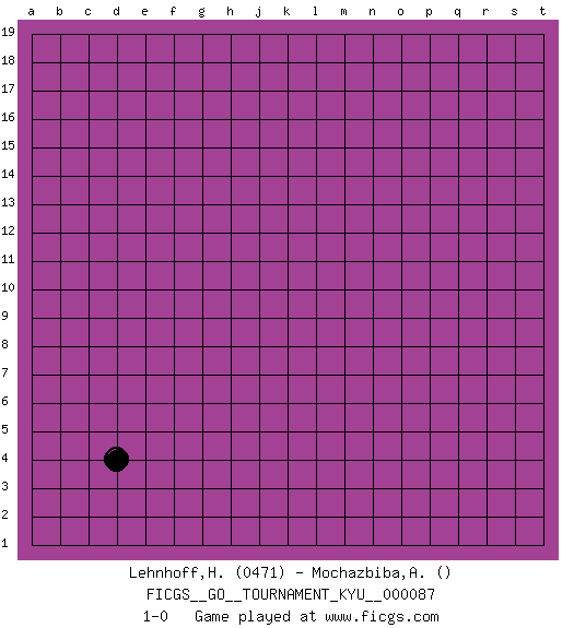 Last move : 1-0 2009 August 24 9:20:32 [Event "FICGS__GO__TOURNAMENT_KYU__000087"] [Site "FICGS"] [Date "2009.07.24"] [Round "1"] [Black "Lehnhoff,Heinz-Georg"] [White "Mochazbiba,Akiba"] [Result "1-0"] [Rating 1 "0471"] 1.d4 1-0 This go game has been lost on time (started : 2009.07.24 12:19:34) Here are the names of the openings (joseki) played in the four corners : Corner d4 : d4 1-0 Hoshi (Hwajeom, Seongjeom, Xingwei`) 4-4 Point. The star or hoshi (4-4) point, emphasizing influence at the potential expense of territory. Player Black won this Go (weiqi, baduk) game. Follow this game move after move (download)The simplest move is the best move. (Anonymous) Treat your password like your toothbrush. Don't let anybody else use it, and get a new one every six months. (Clifford Stoll)