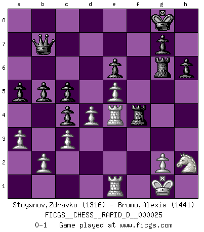 Last move : 0-1 2009 August 18 18:37:24 [Event "FICGS__CHESS__RAPID_D__000025"] [Site "FICGS"] [Date "2009.07.27"] [Round "1"] [White "Stoyanov,Zdravko"] [Black "Bromo,Alexis"] [Result "0-1"] [WhiteElo "1316"] [BlackElo "1441"] 1.e4 e5 2.Nf3 Nc6 3.Bb5 a6 4.Bxc6 dxc6 5.h3 Nf6 6.d3 Bc5 7.a3 h6 8.Nxe5 O-O 9.O-O Re8 10.Nf3 b5 11.Re1 Bb6 12.Be3 c5 13.Nh2 c4 14.Nc3 c6 15.Bxb6 Qxb6 16.d4 Bb7 17.e5 Nd5 18.Ne4 Rad8 19.c3 a5 20.Qg4 Bc8 21.Qg3 Re6 22.Nc5 Rg6 23.Qf3 Be6 24.Nxe6 fxe6 25.Qh5 Nf4 26.Qf3 Rf8 27.Qe4 Nxh3+ 28.Kh1 Nxf2+ 29.Kg1 Nxe4 30.Rxe4 Qb7 31.Rf1 c5 32.Rfe1 Rf4 0-1 Ruy Lopez : Exchange variation Kingside Castling by player Black (move 8) Kingside Castling by player White (move 9) Player Black won this chess game. Follow this game move after move (download)Checkers is for tramps. (Paul Morphy) Ohne ihre Erfolge schmälern zu wollen würde ich sagen Petrosian, Spassky und Karpov verdanken ihre Siege ihren Trainern - Boleslavsky, Bondarevsky und Furman. (Mikhail Moiseyevich Botvinik) El ganador de una partida es aquel jugador que hace el penúltimo error. (Savielly Tartakover) L'ordinateur a tué l'originalité. Il n'y a plus guère d'aventures sur l'échiquier. (Jacob Murray) Nothing is more important for teaching us to understand the concepts we have than constructing fictitious ones. (Ludwig Wittgenstein)