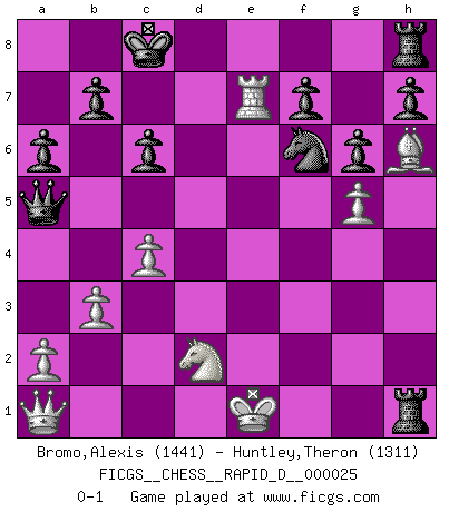 Last move : 0-1 2009 August 16 19:43:54 [Event "FICGS__CHESS__RAPID_D__000025"] [Site "FICGS"] [Date "2009.07.27"] [Round "1"] [White "Bromo,Alexis"] [Black "Huntley,Theron"] [Result "0-1"] [WhiteElo "1441"] [BlackElo "1311"] 1.d4 Nf6 2.c4 c5 3.e3 g6 4.Nc3 a6 5.Nf3 Bg7 6.b3 cxd4 7.exd4 Nc6 8.d5 Ng4 9.h3 Bxc3+ 10.Bd2 Bxa1 11.Qxa1 Nf6 12.dxc6 dxc6 13.Bh6 Qa5+ 14.Nd2 Bf5 15.Be2 O-O-O 16.g4 Be4 17.f3 Bd3 18.Bxd3 Rxd3 19.Rh2 Rxf3 20.g5 Re3+ 21.Re2 Rxh3 22.Rxe7 Rh1+ 0-1 Benoni defense Queenside Castling by player Black (move 15) Player Black won this chess game. Follow this game move after move (download)If a ruler does not understand Chess, how can he rule over a kingdom ? (King Khusros II) Die Idee von Capablanca, Schach als Fach in den Schulen zu lehren, ist großartig. (Fidel Castro) No soy una persona materialista y por eso, no resiento la falta o pérdida del dinero. La ausencia de cosas mundanas carece de importancia. Ya que el Ajedrez es una forma en la que puedo ser tan materialista como yo desee sin tener la necesidad de vender mi alma. (Jamie Walter Adams) Le temps de noter son nom sur la feuille de partie, j'étais déjà en zeitnot ! D'un modeste amateur apparié lors de la première ronde d'un open contre le grand-maître Azmaïparashvili. Man is still the most extraordinary computer of all. (John F. Kennedy)