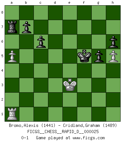 Last move : 0-1 2009 September 2 6:48:11 [Event "FICGS__CHESS__RAPID_D__000025"] [Site "FICGS"] [Date "2009.07.27"] [Round "1"] [White "Bromo,Alexis"] [Black "Cridland,Graham"] [Result "0-1"] [WhiteElo "1441"] [BlackElo "1489"] 1.d4 Nf6 2.c4 c6 3.Nc3 d5 4.e3 a6 5.Nf3 Bg4 6.h3 Bh5 7.Be2 e6 8.c5 Nbd7 9.b4 Be7 10.Ne5 Bxe2 11.Qxe2 O-O 12.O-O Ne8 13.e4 Nxe5 14.dxe5 Nc7 15.a4 a5 16.Ba3 Na6 17.Rfb1 axb4 18.Bxb4 Bxc5 19.Bxc5 Nxc5 20.f3 Qb8 21.Kh1 Qxe5 22.a5 dxe4 23.Nxe4 Nxe4 24.Qxe4 Qxe4 25.fxe4 Rfb8 26.g4 Kf8 27.Kg2 Ke7 28.Kf3 Ra7 29.Rb2 Rd8 30.Kf4 f6 31.h4 g6 32.Ke3 h6 33.Rd2 Rxd2 34.Kxd2 g5 35.h5 Kd6 36.Kd3 Ke5 37.Ke3 f5 38.exf5 exf5 39.gxf5 Kxf5 0-1 Queen's pawn game Kingside Castling by player Black (move 11) Kingside Castling by player White (move 12) 10 pieces endgame at move 39 : White KRPP , Black KRPPPP WHITE : King + 1 Rook 2 Pawns BLACK : King + 1 Rook 4 Pawns Player Black won this chess game. Follow this game move after move (download)Chess, like love, like music, has the power to make people happy. (Siegbert Tarrasch) Wenn ich Weiß habe gewinne ich weil ich Weiß habe, wenn ich Schwarz habe gewinne ich weil ich Bogoljubov bin. (Efim Bogoljubov) Creo que una cierta cantidad de temperamento es esperada de los genios del Ajedrez. (Ron Gross) Les échecs, c'est l'art d'analyser. (Mikhail Botvinnik) Work expands to fill the time available. (C. Northcote Parkinson, in Parkinson's Laws)