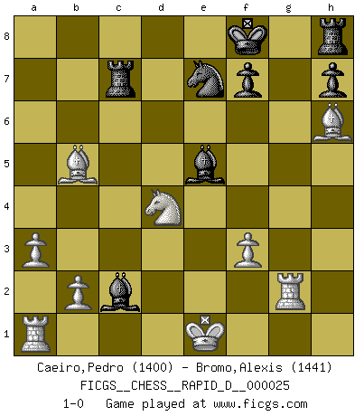Last move : 1-0 2009 August 18 6:20:43 [Event "FICGS__CHESS__RAPID_D__000025"] [Site "FICGS"] [Date "2009.07.27"] [Round "1"] [White "Caeiro,Pedro"] [Black "Bromo,Alexis"] [Result "1-0"] [WhiteElo "1400"] [BlackElo "1441"] 1.e4 c5 2.Nf3 Nc6 3.Nc3 e6 4.Bc4 a6 5.a3 b5 6.Ba2 c4 7.d3 d5 8.dxc4 bxc4 9.exd5 exd5 10.Qxd5 Qxd5 11.Nxd5 Bd6 12.Bxc4 Bb7 13.Be3 Nge7 14.Nxe7 Nxe7 15.Be2 Rc8 16.Nd4 Bxg2 17.Rg1 Be4 18.f3 Bxc2 19.Bxa6 Rc7 20.Rxg7 Bxh2 21.Rg2 Be5 22.Bb5+ Kf8 23.Bh6+ 1-0 Sicilian defense Player White won this chess game. Follow this game move after move (download)Good positions don't win games, good moves do. (Gerald Abrahams) Der 70jährige Viktor Kortschnoi: Die Rentenanstalt wollte mich zwingen in Rente zu gehen. Meine Frau erhält jetzt eine Pension- und ich zahle weiter in die Rentenkasse ein! (Viktor Kortschnoi) No volvere nunca a jugar contigo. Has insultado a mi amigo. - cuando un oponente se maldijo por una mala jugada (Miguel Najdorf) Pour moi, les échecs ne sont pas un jeu mais un art. (Alexandre Alekhine) Tree pose grows confidence. It roots me to this world. (Terri Guillemets)