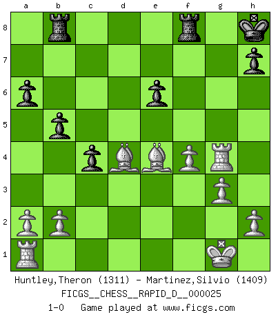 Last move : 1-0 2009 September 6 23:23:24 [Event "FICGS__CHESS__RAPID_D__000025"] [Site "FICGS"] [Date "2009.07.27"] [Round "1"] [White "Huntley,Theron"] [Black "Martinez,Silvio"] [Result "1-0"] [WhiteElo "1311"] [BlackElo "1409"] 1.c4 c5 2.Nf3 Nc6 3.g3 d5 4.cxd5 Qxd5 5.Nc3 Qd7 6.Bg2 Nf6 7.d3 e6 8.O-O Bd6 9.d4 c4 10.e4 O-O 11.e5 Bxe5 12.Nxe5 Nxe5 13.dxe5 Qxd1 14.Rxd1 Nd7 15.f4 a6 16.Ne4 Rb8 17.Be3 b5 18.Rd6 Bb7 19.Rxd7 Bxe4 20.Bxe4 f5 21.exf6 Rxf6 22.Bd4 R6f8 23.Rxg7+ Kh8 24.Rg4 1-0 English : Symmetrical variation Kingside Castling by player White (move 8) Kingside Castling by player Black (move 10) Player White won this chess game. Follow this game move after move (download)Fischer was a master of clarity and a king of artful positioning. His opponents would see where he was going but were powerless to stop him. (Bruce Pandolfini) Frage des Reporters: -Worin besteht das Ziel von Gambiteröffnungen? Antwort: -Auf Kosten der Partie einen Ruf als Angriffspieler zu erwerben.- (Siegbert Tarrasch) Después de la respuesta de las negras a 1.e4 con 1..e5, se quedan siempre tratando de entrar dentro del juego. (Howard Staunton) Vous savez, camarade Pachman, je n'éprouve pas de plaisir à être ministre, je jouerais plutôt aux échecs comme vous, ou alors ferais une révolution au Venezuela. (Che Guevara à Ludek Pachman, 'Checkmate in Prague', 1975) The message for business people contemplating their place in the cyberspace is simple and direct: get linked or get lost. (Vic Sussman and Kenan Pollack)