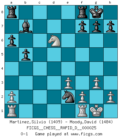 Last move : 0-1 2009 August 27 7:21:26 [Event "FICGS__CHESS__RAPID_D__000025"] [Site "FICGS"] [Date "2009.07.27"] [Round "1"] [White "Martinez,Silvio"] [Black "Moody,David"] [Result "0-1"] [WhiteElo "1409"] [BlackElo "1484"] 1.Nf3 b5 2.b4 Bb7 3.Na3 a6 4.Bb2 e6 5.d4 Nf6 6.e3 Bxb4+ 7.Nd2 Ne4 8.c3 Bxc3 9.Bxc3 Nxc3 10.Qb3 Nd5 11.g3 Nc6 12.Bg2 O-O 13.O-O Qe7 14.Bxd5 exd5 15.Qxd5 Qxa3 16.Qxd7 Qd6 17.Qxd6 cxd6 18.Ne4 Nxd4 19.Nxd6 Ne2+ 0-1 Reti Opening Kingside Castling by player Black (move 12) Kingside Castling by player White (move 13) Player Black won this chess game. Follow this game move after move (download)It's always better to sacrifice your opponent's men. (Savielly Tartakover) Später, ... hatte ich zunehmend Erfolg in entscheidenden Partien. Vielleicht weil ich eine einfache Wahrheit erkannte: nicht nur ich hatte Angst, auch mein Gegner. (Mikhail Nekhemyevich Tal) Sin errores no puede haber brillantez. (Emanuel Lasker) Des combinaisons [dans le jeu d'échecs] pareilles à des mélodies. Je crois entendre pour ainsi dire la musique des coups... (Vladimir Nabokov) Big Chess is a place for big hallucinations. (Thibault de Vassal)
