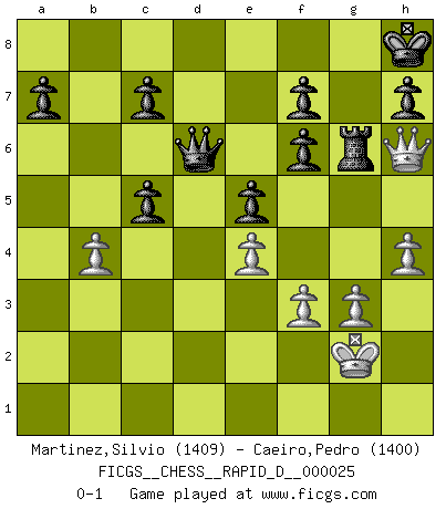 Last move : 0-1 2009 September 9 5:11:9 [Event "FICGS__CHESS__RAPID_D__000025"] [Site "FICGS"] [Date "2009.07.27"] [Round "1"] [White "Martinez,Silvio"] [Black "Caeiro,Pedro"] [Result "0-1"] [WhiteElo "1409"] [BlackElo "1400"] 1.e4 e5 2.Nf3 Nf6 3.Nc3 d6 4.d4 Bg4 5.Be2 Bxf3 6.Bxf3 Nc6 7.O-O exd4 8.Ne2 Ne5 9.Nxd4 Be7 10.c3 O-O 11.Bf4 Nxf3+ 12.Qxf3 Nd7 13.Nf5 Bf6 14.Qg3 Ne5 15.Bxe5 dxe5 16.h4 Qe8 17.Nh6+ Kh8 18.Ng4 Rd8 19.Nxf6 gxf6 20.Qe3 b6 21.b4 Qe6 22.a4 Rg8 23.Rad1 Qg4 24.g3 Rxd1 25.Rxd1 Qxd1+ 26.Kg2 Qxa4 27.Qh6 Qc6 28.f3 Qd6 29.c4 Rg6 30.c5 bxc5 0-1 Petrov Three knights game Kingside Castling by player White (move 7) Kingside Castling by player Black (move 10) Player Black won this chess game. Follow this game move after move (download)The game of chess is the touchstone of the intellect. (Goethe) Man kann eine Schachpartie nur gewinnen, wenn das Gleichgewicht gestört ist. In einer Stellung mit ungestörtem Gleichgewicht ist auch das größte Genie hilflos - in der Stellung steckt dann eben kein genialer Einfall. (Wilhelm Steinitz) Me gusta decir que Bobby Fischer fue el mejor jugador que jamás haya existido. Pero lo que hizo de Fischer un genio, fue su habilidad de mezclar una frescura y pragmatismo Americano con ideas Rusas acerca de la estrategia. (Bruce Pandolfini) Le jeu d'échecs fait naître et fortifie en nous plusieurs qualités précieuses dans le cours de l'existence, telles que la prévoyance, la circonspection, la prudence, et la persévérance. (Benjamin Franklin - 1783, la morale des échecs) What doesn't kill us makes us stronger. (Friedrich Nietzsche)