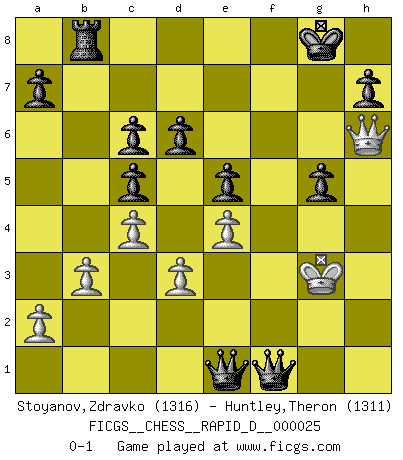 Last move : 0-1 2009 August 3 13:25:20 [Event "FICGS__CHESS__RAPID_D__000025"] [Site "FICGS"] [Date "2009.07.27"] [Round "1"] [White "Stoyanov,Zdravko"] [Black "Huntley,Theron"] [Result "0-1"] [WhiteElo "1316"] [BlackElo "1311"] 1.e4 c5 2.Nf3 Nc6 3.Bb5 d6 4.Bxc6+ bxc6 5.h3 e5 6.O-O f5 7.d3 Nf6 8.Bg5 Rb8 9.b3 Be7 10.Nbd2 O-O 11.c4 Qe8 12.Re1 Qg6 13.Re3 f4 14.Re2 Bxh3 15.Qf1 Be6 16.Bxf6 Rxf6 17.Nh4 Qh5 18.Ndf3 Rh6 19.g3 Bg4 20.Qg2 Bxh4 21.Nxh4 f3 22.Qh2 fxe2 23.Re1 g5 24.f3 Bxf3 25.Nxf3 Qxf3 26.Qxh6 Qxg3+ 27.Kh1 Qxe1+ 28.Kg2 Qf1+ 29.Kg3 e1Q+ 0-1 Sicilian : Nimzovich-Rossolimo attack (without ...d6) Kingside Castling by player White (move 6) Kingside Castling by player Black (move 10) Promotion Queen by player Black (move 29) Player Black won this chess game. Follow this game move after move (download)Chess is the art which expresses the science of logic. (Mikhail Botvinnik) Im Leben werden Partien nie so unstrittig gewonnen wie im Spiel (Emanuel Lasker) Te sientas frente a un tablero y repentinamente tu corazón brinca. Tu mano tiembla al tomar una pieza y moverla. Pero lo que el Ajedrez te enseña es que tu debes permanecer ahí con calma y pensar de que si realmente es una buena idea o de que si hay otras ideas mejores. (Stanley Kubrick) J'ai vu le vaincu d'Echecs jouer des années durant dans l'espoir de la fête de la victoire. Car tu es plus riche de ce qu'elle existe si même elle n'est point pour toi. Ainsi de la perle du fond des mers. (Antoine de Saint-Exupéry) A proverb is a short sentence based on long experience. (Miguel de Cervantes)