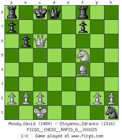Last move : 1-0 2009 August 3 16:36:26 [Event "FICGS__CHESS__RAPID_D__000025"] [Site "FICGS"] [Date "2009.07.27"] [Round "1"] [White "Moody,David"] [Black "Stoyanov,Zdravko"] [Result "1-0"] [WhiteElo "1484"] [BlackElo "1316"] 1.Nc3 c5 2.e4 b6 3.Nf3 d6 4.d4 cxd4 5.Nxd4 e5 6.Bb5+ Bd7 7.Nf5 Bxb5 8.Nxb5 h6 9.Nbxd6+ Bxd6 10.Nxd6+ Ke7 11.Nf5+ Ke8 12.Nxg7+ Ke7 13.Nf5+ Ke8 14.Qg4 Nf6 15.Qg3 Nbd7 16.Bxh6 Nxe4 17.Qg7 Rf8 18.O-O-O Nxf2 19.Rxd7 Kxd7 20.Qxe5 Nxh1 21.Qd5+ Kc7 22.Bf4+ Kc8 23.Qc6+ 1-0 Dunst (Sleipner, Heinrichsen) Opening Queenside Castling by player White (move 18) Player White won this chess game. Follow this game move after move (download)What would Chess be without silly mistakes ? (Kurt Richter) Die Jungen erwarten, dass Opa einfach umfällt. Dann aber kann Opa fünf Stunden lang Schach spielen und die jungen Gegner an die Wand drücken. (Viktor Kortschnoi) Yo adoro todas la posiciones. Denme una partida posicional difícil, y la jugaré. Pero posiciones totalmente ganadas, no las tolero. (Hein Donner) Le joueur d'Echecs qui veut atteindre le top est obligé de développer son propre credo créatif. Alexeï Stepanovicth Souétine. Il est facile d'écrire des livres ! Ce qui est difficile, c'est de jouer ! (Alexeï Stepanovicth Souétine) Dave, my mind is going. I can feel it. (HAL 9000 in 2001, a space odyssey)