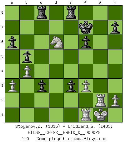 Last move : 1-0 2009 August 30 18:9:19 [Event "FICGS__CHESS__RAPID_D__000025"] [Site "FICGS"] [Date "2009.07.27"] [Round "1"] [White "Stoyanov,Zdravko"] [Black "Cridland,Graham"] [Result "1-0"] [WhiteElo "1316"] [BlackElo "1489"] 1.e4 c5 2.Nf3 Nc6 3.Bb5 e6 4.Bxc6 dxc6 5.c3 Qd3 6.Ng5 Be7 7.Qf3 Qxf3 8.Nxf3 Nf6 9.d3 Nd7 10.O-O e5 11.Nbd2 O-O 12.Nc4 f6 13.Nh4 b5 14.Na5 Nb8 15.Re1 Be6 16.Be3 Rc8 17.Nb7 Nd7 18.f4 Rab8 19.Na5 Nb6 20.f5 Bf7 21.Nb3 Na4 22.Rab1 Rd8 23.d4 cxd4 24.cxd4 exd4 25.Bxd4 c5 26.Be3 Bd6 27.Nf3 a6 28.Re2 Rbc8 29.Nfd2 Be5 30.Nf3 Bb8 31.Rc2 c4 32.Nbd4 Nc5 33.Ne2 Nxe4 34.Ned4 Nc5 35.b4 Nd3 36.a3 Re8 37.Re2 Bh5 38.Ne6 Bxf3 39.gxf3 g6 40.Nd4 Ba7 41.Nc2 gxf5 42.Rg2+ Kf7 43.Bxa7 Ne5 44.Nd4 f4 45.Rf1 c3 46.Bc5 Nc4 47.Nf5 Ne3 48.Bxe3 fxe3 49.Nd6+ 1-0 Sicilian : Nimzovich-Rossolimo attack (without ...d6) Kingside Castling by player White (move 10) Kingside Castling by player Black (move 11) Player White won this chess game. Follow this game move after move (download)When you are lonely, when you feel yourself an alien in the world, play Chess. This will raise your spirits and be your counselor in war. (Aristotle) Schach ist Leben. (Robert James Fischer) Debemos de asegurarnos de que el Ajedrez no se convierta en un lenguaje muerto, muy interesante, pero tan solo para un grupo muy pequeño. (Sytze Faber) Les erreurs sont comme les malheurs, elles n'arrivent jamais seules. (Siegbert Tarrasch) But they are useless. They can only give you answers. (Pablo Picasso, about computers)