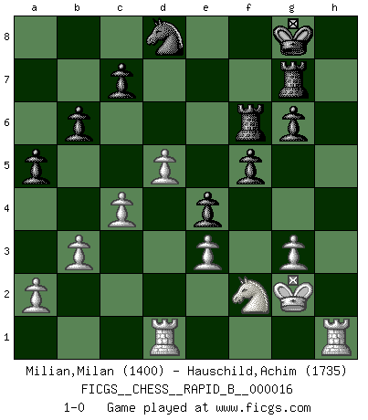 Last move : 1-0 2006 December 24 20:3:30 [Event "FICGS__CHESS__RAPID_B__000016"] [Site "FICGS"] [Date "2006.09.20"] [Round "1"] [White "Milian,Milan"] [Black "Hauschild,Achim"] [Result "1-0"] [WhiteElo "1400"] [BlackElo "1735"] 1.c4 Nf6 2.d4 e6 3.Nf3 b6 4.g3 Bb7 5.Bg2 Be7 6.Nc3 O-O 7.O-O Ne4 8.Qd3 Nxc3 9.Qxc3 f5 10.b3 Bf6 11.Bb2 a5 12.Rad1 d6 13.Ne1 Bxg2 14.Nxg2 Nc6 15.Qd2 Qd7 16.Nf4 Qf7 17.e3 Rae8 18.Kg2 g5 19.Nd3 Qh5 20.f4 g4 21.Nf2 Qg6 22.Rh1 Re7 23.h3 gxh3+ 24.Rxh3 Rg7 25.Qe2 e5 26.fxe5 dxe5 27.d5 Nd8 28.Qh5 e4 29.Qxg6 hxg6 30.Bxf6 Rxf6 31.R3h1 1-0 This chess game has been lost on time (started : 2006.09.20 23:24:12) English, 1...Nf6 (Anglo-Indian defense) Kingside Castling by player Black (move 6) Kingside Castling by player White (move 7) Player White won this chess game. Follow this game move after move (download)Some sacrifices are sound; the rest are mine. (Mikhail Tal) Du musst nicht gut spielen, es reicht, wenn du besser spielst als dein Gegner. (Anonymous) Todos los Maestros de Ajedrez fueron un día unos principiantes. (Chernev) RxDa4 pat (...) A married woman is like a fish riding a bicycle. (Rodolfo d'Ettorre)