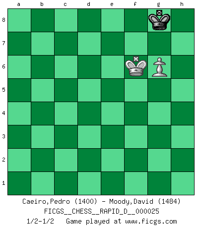 Last move : 1/2-1/2 2009 August 4 5:33:45 [Event "FICGS__CHESS__RAPID_D__000025"] [Site "FICGS"] [Date "2009.07.27"] [Round "1"] [White "Caeiro,Pedro"] [Black "Moody,David"] [Result "1/2-1/2"] [WhiteElo "1400"] [BlackElo "1484"] 1.e4 e5 2.Nf3 Nc6 3.d4 exd4 4.Nxd4 Bc5 5.Be3 Qf6 6.c3 Nge7 7.Bc4 b6 8.O-O Bb7 9.Nb5 O-O-O 10.Bxc5 bxc5 11.f3 a6 12.N5a3 d5 13.exd5 Ne5 14.Nd2 Nxc4 15.Naxc4 Nxd5 16.Qb3 Nb6 17.Rae1 Bd5 18.Nxb6+ cxb6 19.Qa3 Bb7 20.Ne4 Qc6 21.b4 c4 22.Rf2 Rd3 23.Qc1 Rhd8 24.Rd2 Qd7 25.Rxd3 Qxd3 26.a4 Bxe4 27.Rxe4 Qd1+ 28.Qxd1 Rxd1+ 29.Kf2 b5 30.axb5 axb5 31.Re5 Rd3 32.Rxb5 Rxc3 33.Rc5+ Kd7 34.b5 Rb3 35.Rxc4 Rxb5 36.Re4 Rb2+ 37.Kg3 Ra2 38.h4 Ra6 39.Kf4 Rf6+ 40.Kg3 Rg6+ 41.Kh3 Re6 42.Ra4 Kd6 43.g4 Re1 44.Kg3 Ke5 45.Ra5+ Ke6 46.h5 Rd1 47.f4 Rg1+ 48.Kh4 Rh1+ 49.Kg3 Rg1+ 50.Kf3 Rf1+ 51.Ke3 Re1+ 52.Kf2 Rh1 53.Re5+ Kd6 54.Re8 f5 55.Rg8 fxg4 56.Rxg7 Rxh5 57.Rxg4 Ke6 58.Kg3 Rh1 59.Rg5 Rg1+ 60.Kh4 Rh1+ 61.Kg3 Rg1+ 62.Kh3 Rxg5 63.fxg5 Kf5 64.Kh4 Kg6 65.Kg4 h5+ 66.Kh4 Kg7 67.Kxh5 Kh7 68.g6+ Kg7 69.Kg5 Kg8 70.Kf5 Kg7 71.Kg5 Kg8 72.Kf6 Kf8 73.Ke6 Kg7 74.Kf5 Kg8 75.Kf6 1/2-1/2 Scotch game Kingside Castling by player White (move 8) Queenside Castling by player Black (move 9) 10 pieces endgame at move 35 : White KRPPP , Black KRPPP WHITE : King + 1 Rook 3 Pawns BLACK : King + 1 Rook 3 Pawns 9 pieces endgame at move 55 : White KRPP , Black KRPPP WHITE : King + 1 Rook 2 Pawns BLACK : King + 1 Rook 3 Pawns 8 pieces endgame at move 56 : White KRPP , Black KRPP WHITE : King + 1 Rook 2 Pawns BLACK : King + 1 Rook 2 Pawns 7 pieces endgame at move 56 : White KRP , Black KRPP WHITE : King + 1 Rook 1 Pawn BLACK : King + 1 Rook 2 Pawns 6 pieces endgame at move 57 : White KRP , Black KRP WHITE : King + 1 Rook 1 Pawn BLACK : King + 1 Rook 1 Pawn 5 pieces endgame at move 62 : White KP , Black KRP WHITE : King + 1 Pawn BLACK : King + 1 Rook 1 Pawn 4 pieces endgame at move 63 : White KP , Black KP WHITE : King + 1 Pawn BLACK : King + 1 Pawn 3 pieces endgame at move 67 : White KP , Black K WHITE : King + 1 Pawn BLACK : King + This chess game ended in a draw. Follow this game move after move (download)Before the endgame, the Gods have placed the middle game. (Siegbert Tarrasch) Auf jeden Fall musst du zuerst Rechtsanwalt werden, damit du deine eigenen Interessen und die deiner Familie vertreten kannst. [Brief an seinen Sohn] (José Raúl Capablanca) Fischer es el jugador mas fuerte del mundo. De hecho, el jugador mas fuerte que jamas haya existido. (Larry Evans) Seul un grand joueur sait à quel point il joue faiblement. (Xavier Tartacover) Never risk one's whole fortune unless supported by one's entire army. (Niccolo Machiavelli)