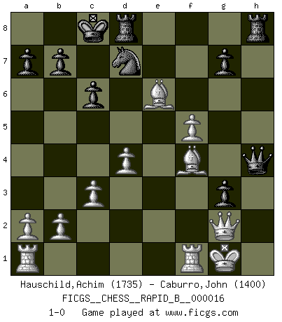 Last move : 1-0 2006 October 18 12:42:8 [Event "FICGS__CHESS__RAPID_B__000016"] [Site "FICGS"] [Date "2006.09.20"] [Round "1"] [White "Hauschild,Achim"] [Black "Caburro,John"] [Result "1-0"] [WhiteElo "1735"] [BlackElo "1400"] 1.e4 d5 2.exd5 Qxd5 3.Nc3 Qa5 4.d4 c6 5.Nf3 Nf6 6.Bc4 Bf5 7.Ne5 e6 8.g4 Be4 9.O-O Bd5 10.Bd3 Nbd7 11.f4 Bb4 12.Nxd5 Qxd5 13.c3 Be7 14.Qe2 h5 15.g5 Ng4 16.Bc4 Qd6 17.g6 fxg6 18.Nxg6 Rh6 19.Nxe7 Qxe7 20.h3 O-O-O 21.f5 R6h8 22.hxg4 hxg4 23.Bf4 Qh4 24.Bxe6 g3 25.Qg2 1-0 Scandinavian (centre counter) defense Kingside Castling by player White (move 9) Queenside Castling by player Black (move 20) Player White won this chess game. Follow this game move after move (download)A good sacrifice is one that is not necessarily sound but leaves your opponent dazed and confused. (Rudolph Spielmann) Wir irren allesamt, nur jeder irrt anders. (Georg Christoph Lichtenberg) Hay jugadores fuertes y personas amables y yo soy un jugador fuerte. (Bobby Fischer) La guerre est enfant de la passion, la passion est enfant du narcissisme et le narcissisme est l'enfant. (...) Une autre partie ? (Thibault de Vassal) Perception is reality. (Immanuel Kant)