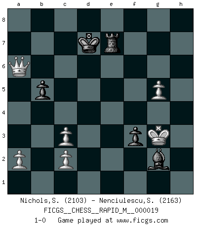 Last move : 1-0 2009 September 30 22:9:43 [Event "FICGS__CHESS__RAPID_M__000019"] [Site "FICGS"] [Date "2009.07.27"] [Round "1"] [White "Nichols,Scott"] [Black "Nenciulescu,Silviu"] [Result "1-0"] [WhiteElo "2103"] [BlackElo "2163"] 1.e4 c5 2.Nf3 d6 3.d4 cxd4 4.Nxd4 Nf6 5.Nc3 a6 6.Be3 e5 7.Nb3 Be7 8.h3 Be6 9.Qf3 O-O 10.g4 d5 11.exd5 Nxd5 12.Rd1 Nxc3 13.Rxd8 Rxd8 14.bxc3 Bd5 15.Qf5 Bxh1 16.Bc4 Nc6 17.Qxf7+ Kh8 18.Nc5 Rf8 19.Qh5 Bxc5 20.Bxc5 Rf6 21.Bd3 e4 22.Bc4 b5 23.Bd5 Rd8 24.f4 exf3 25.Kf2 h6 26.h4 Kh7 27.Bb6 g6 28.Bxd8 Re6 29.Be4 Rxe4 30.Qd5 Re2+ 31.Kg3 Nxd8 32.Qd7+ Kg8 33.Qxd8+ Kf7 34.g5 hxg5 35.hxg5 Re6 36.Qd7+ Re7 37.Qh3 Bg2 38.Qh7+ Kf8 39.Qh8+ Kf7 40.Qf6+ Ke8 41.Qxg6+ Kd7 42.Qxa6 1-0 Sicilian : Najdorf, Byrne (English) attack Kingside Castling by player Black (move 9) Player White won this chess game. Follow this game move after move (download)In order to improve your game, you must study the endgame before everything else, for whereas the endings can be studied and mastered by themselves, the middle game and the opening must be studied in relation to the endgame. (Jose Raul Capablanca) Zeige mir drei Eröffnungsvarianten und ich beweise dir, dass zwei davon inkorrekt sind. (Emanuel Lasker) Solo existe una cosa que Fischer hace en el Ajedrez sin placer: ¡perder!. (Boris Spassky) Si le désir cupide (et stupide) de gagner est une inépuisable source de souffrance, une combinaison brillante sur l'échiquier est une découverte : le coquelicot qui s'épanouit lorsque apparaît la Voie Lactée. (Arrabal) The project of the man are lower than those of the sky. (Chinese proverb)