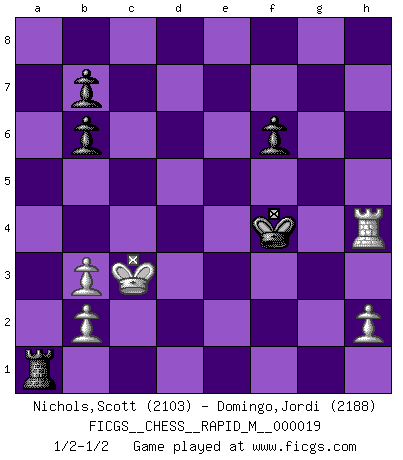 Last move : 1/2-1/2 2009 October 16 14:19:6 [Event "FICGS__CHESS__RAPID_M__000019"] [Site "FICGS"] [Date "2009.07.27"] [Round "1"] [White "Nichols,Scott"] [Black "Domingo,Jordi"] [Result "1/2-1/2"] [WhiteElo "2103"] [BlackElo "2188"] 1.e4 e5 2.d4 exd4 3.c3 d5 4.exd5 Qxd5 5.Nf3 Nc6 6.cxd4 Bg4 7.Be2 Bb4+ 8.Nc3 Bxf3 9.Bxf3 Qc4 10.Qb3 Qxb3 11.axb3 Nge7 12.Bg5 Nf5 13.O-O-O Nfxd4 14.Bxc6+ Nxc6 15.Rhe1+ Kf8 16.Bf4 Ba5 17.Be3 h5 18.Rd7 Kg8 19.Red1 h4 20.Nd5 h3 21.g4 Ne5 22.Ne7+ Kf8 23.R7d5 f6 24.Bf4 Kxe7 25.Bxe5 Bb6 26.Rd7+ Ke6 27.Bxc7 Rhc8 28.R1d6+ Ke5 29.Rxb6 Rxc7+ 30.Rxc7 axb6 31.Rxg7 Kf4 32.Kd2 Ra2 33.Kc3 Ra1 34.Rh7 Kxg4 35.f3+ Kxf3 36.Rxh3+ Ke4 37.Rh4+ Ke3 38.Rh3+ Kf4 39.Rh4+ 1/2-1/2 Danish gambit : Soerensen defense Queenside Castling by player White (move 13) 10 pieces endgame at move 36 : White KRPPP , Black KRPPP WHITE : King + 1 Rook 3 Pawns BLACK : King + 1 Rook 3 Pawns This chess game ended in a draw. Follow this game move after move (download)I guess a certain amount of temperament is expected of Chess geniuses. (Ron Gross) Das Schachspiel übertrifft alle anderen Spiele so weit wie der Chimborasso einen Misthaufen. (Arthur Schopenhauer) Me dio la sensación de como si yo estuviera jugando en contra del mismo Ajedrez. - al estar jugando en contra de Robert Fischer (Walter Shipman) La vie est comme un jeu d'échecs : nous esquissons un plan, mais celui-ci est tributaire de ce que daignent faire l'adversaire aux échecs et le destin dans la vie. (Arthur Schopenhauer) He who is a good ruler must first have been ruled. (Aristotle)