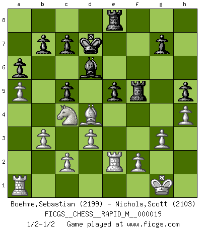 Last move : 1/2-1/2 2009 September 10 3:23:2 [Event "FICGS__CHESS__RAPID_M__000019"] [Site "FICGS"] [Date "2009.07.27"] [Round "1"] [White "Boehme,Sebastian"] [Black "Nichols,Scott"] [Result "1/2-1/2"] [WhiteElo "2199"] [BlackElo "2103"] 1.e4 e5 2.Nf3 Nc6 3.Bb5 a6 4.Bxc6 dxc6 5.O-O Be6 6.Nxe5 Qd4 7.Nf3 Qxe4 8.Ng5 Qg6 9.Nxe6 fxe6 10.d3 O-O-O 11.Nd2 Nf6 12.Nf3 Bd6 13.Re1 Qh5 14.Qe2 Rde8 15.a4 Rhf8 16.a5 Nd5 17.Ra4 Nb4 18.Ne5 Qxe2 19.Rxe2 c5 20.Nc4 Rf5 21.b3 h5 22.h4 Kd7 23.g3 Nc6 24.Bb2 e5 25.Ra1 Nd4 26.Bxd4 1/2-1/2 Ruy Lopez : Exchange variation, 5.O-O Kingside Castling by player White (move 5) Queenside Castling by player Black (move 10) This chess game ended in a draw. Follow this game move after move (download)The essence of Chess is thinking about what Chess is. (David Bronstein) Dass jemand wie Surab Asmaiparaschwili, der selbst Elopunkte gekauft hat , Vize-Präsident der Fide werden konnte, sagt schon einges über den Zustand dieser Organisation aus. (Joel Lautier) Entre mas años cumplo, mas valoro los Peones. (Keres) Roi des jeux et jeu des rois, les échecs portent en eux un sentiment d'infini. Ils donnent à celui qui s'est efforcé d'en approfondir les arcanes l'impression de n'être pas à la mesure de l'homme; en fait, ils constituent un résumé de l'univers, un microcosme, et figurent cette grande échelle qui, dans les plans de la lumière descend jusqu'à la matière, qui des abîmes insondables remonte jusqu'en l'infini de Dieu. (Pyrame) A good programmer is someone who always looks both ways before crossing a one-way street. (Doug Linder)