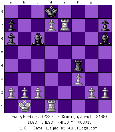 Last move : 1-0 2009 October 12 11:3:24 [Event "FICGS__CHESS__RAPID_M__000019"] [Site "FICGS"] [Date "2009.07.27"] [Round "1"] [White "Kruse,Herbert"] [Black "Domingo,Jordi"] [Result "1-0"] [WhiteElo "2230"] [BlackElo "2188"] 1.e4 e5 2.Nf3 f5 3.exf5 e4 4.Nd4 Qf6 5.Nb5 Na6 6.N1c3 c6 7.Nxe4 Qe5 8.Nbc3 d5 9.d4 Qe7 10.Bg5 Nf6 11.Bxf6 gxf6 12.Qh5+ Kd8 13.O-O-O dxe4 14.Bxa6 bxa6 15.d5 c5 16.d6 Qg7 17.Kb1 Bd7 18.Nxe4 Rb8 19.Rhe1 Rb6 20.Qf3 Rg8 21.Qc3 Bxf5 22.Nxf6 Bd7 23.Qe5 Qf7 24.Nxg8 Qxg8 25.Qxc5 Bc6 26.Re7 Qg4 27.f3 Qb4 28.Qxb4 Rxb4 29.Rf7 Bh6 30.d7 Rf4 31.Re7 1-0 Latvian counter-gambit Queenside Castling by player White (move 13) Player White won this chess game. Follow this game move after move (download)With or without the title, Bobby Fischer was unquestionably the greatest player of his time. (Burt Hochberg) Schach ist eine Sache der genauen Beurteilung, wann man zuschlagen und wann man sich ducken muss. (Robert James Fischer) ¿Esta Bobby Fischer algo cuerdo?. (Salo Flohr) Karpov est une pièce de musée. (Garry Kasparov) Life is pleasant. Death is peaceful. It's the transition that's troublesome. (Isaac Asimov)