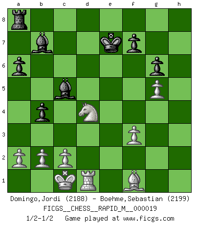 Last move : 1/2-1/2 2009 October 28 0:0:40 [Event "FICGS__CHESS__RAPID_M__000019"] [Site "FICGS"] [Date "2009.07.27"] [Round "1"] [White "Domingo,Jordi"] [Black "Boehme,Sebastian"] [Result "1/2-1/2"] [WhiteElo "2188"] [BlackElo "2199"] 1.e4 c5 2.Nf3 d6 3.d4 cxd4 4.Nxd4 Nf6 5.Nc3 a6 6.Be3 e6 7.f3 b5 8.g4 h6 9.Qd2 b4 10.Nce2 Nbd7 11.O-O-O Qc7 12.h4 d5 13.Bf4 e5 14.Bh2 dxe4 15.g5 hxg5 16.hxg5 Rxh2 17.Rxh2 exd4 18.Rh4 Ng4 19.Qxd4 Nge5 20.Rxe4 Bc5 21.Qd5 Bb7 22.Qxd7+ Qxd7 23.Rxe5+ Qe7 24.Rxe7+ Kxe7 25.Nd4 g6 1/2-1/2 Sicilian : Najdorf, Byrne (English) attack Queenside Castling by player White (move 11) This chess game ended in a draw. Follow this game move after move (download)Personally, I rather look forward to a computer program winning the world Chess Championship. Humanity needs a lesson in humility. (Richard Dawkings) Ich würde mich als ganz normalen Jungen bezeichnen [Im Alter von 12]. (Sergej Karjakin) El Ajedrez es una manera fabulosa para que los niños aprendan a autovalorarse y a autoestimarse. (Saudin Robovic) Lorsque vous vous retrouvez devant une position atroce, ne tendez pas un ultime piège dérisoire avec l'intention d'abandonner si l'adversaire le déjoue ! Faites-vous plutôt un devoir de résister comme si votre vie en dépendait. Jouez le coup qui vous déplairait au centuple si vous étiez dans la peau de votre tortionnaire ! Luck is when opportunity knocks and you answer. (Anonymous)