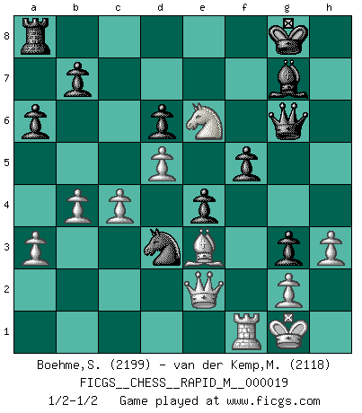 Last move : 1/2-1/2 2009 October 1 8:57:14 [Event "FICGS__CHESS__RAPID_M__000019"] [Site "FICGS"] [Date "2009.07.27"] [Round "1"] [White "Boehme,Sebastian"] [Black "van der Kemp,Michel"] [Result "1/2-1/2"] [WhiteElo "2199"] [BlackElo "2118"] 1.e4 c5 2.Nf3 d6 3.d4 cxd4 4.Nxd4 Nf6 5.Nc3 a6 6.f3 e5 7.Nb3 Be6 8.Be3 h5 9.Qd2 Nbd7 10.Nd5 Bxd5 11.exd5 g6 12.Be2 Bg7 13.O-O O-O 14.c4 e4 15.f4 Ng4 16.Bxg4 hxg4 17.Nd4 Qh4 18.f5 Ne5 19.Qe2 g3 20.h3 Nd3 21.fxg6 fxg6 22.Ne6 Rf5 23.Rxf5 gxf5 24.Rf1 Qh7 25.b4 Qg6 26.a3 1/2-1/2 Sicilian : Najdorf Kingside Castling by player White (move 13) Kingside Castling by player Black (move 13) This chess game ended in a draw. Follow this game move after move (download)Becoming successful at Chess allows you to discover your own personality. That's what I want for the kids I teach. (Saudin Robovic) Ein Isolani verdüstert die Stimmung auf dem ganzen Schachbrett. (Savielly Grigorievitsch Tartakower) Una clavada es mas poderosa que una espada. (Fred Reinfeld) Même si l'adversaire joue le coup analysé précédemment, recommencez l'analyse en voyant la nouvelle position. Première règle de Blumenfeld Quotation,n.: The act of repeating erroneously the words of another. The words erroneously repeated. (Ambrose Bierce, The Devil's Dictionary)