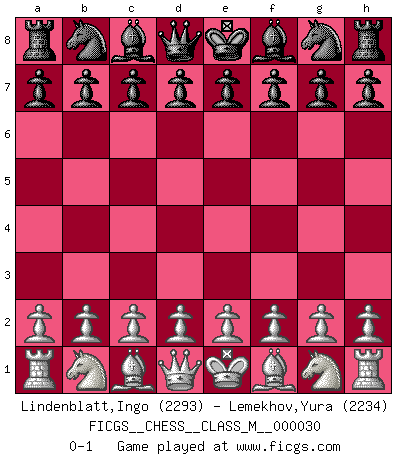 Last move : 0-1 2009 September 6 10:16:4 [Event "FICGS__CHESS__CLASS_M__000030"] [Site "FICGS"] [Date "2009.07.27"] [Round "1"] [White "Lindenblatt,Ingo"] [Black "Lemekhov,Yura"] [Result "0-1"] [WhiteElo "2293"] [BlackElo "2234"] 0-1 This chess game has been lost on time (started : 2009.07.27 18:33:39) Player Black won this chess game. Follow this game move after move (download)Combinations have always been the most intriguing aspect of Chess. The masters look for them, the public applauds them, the critics praise them. It is because combinations are possible that Chess is more than a lifeless mathematical exercise. They are the poetry of the game; they are to Chess what melody is to music. They represent the triumph of mind over matter. (Reuben Fine) Du musst nicht gut spielen, es reicht, wenn du besser spielst als dein Gegner. (Anonymous) Todo se encuentra en un estado de flujo y esto incluye al mundo del Ajedrez. (Mikhail Botvinnik) Soyez une menace à chaque fois que vous vous asseyez pour jouer. (Ken Smith) I don't believe in psychology. I believe in good moves. (Bobby Fischer)