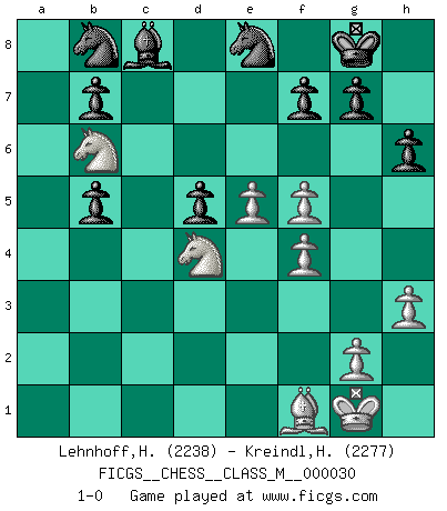 Last move : 1-0 2010 January 10 18:9:35 [Event "FICGS__CHESS__CLASS_M__000030"] [Site "FICGS"] [Date "2009.07.27"] [Round "1"] [White "Lehnhoff,Heinz-Georg"] [Black "Kreindl,Helmut"] [Result "1-0"] [WhiteElo "2238"] [BlackElo "2277"] 1.d4 d5 2.c4 e6 3.Nf3 Nf6 4.Nc3 a6 5.cxd5 exd5 6.Bg5 Be7 7.e3 O-O 8.Qc2 c6 9.Bd3 h6 10.Bf4 Nbd7 11.h3 Re8 12.O-O Nf8 13.Rad1 Be6 14.a3 Bd6 15.Rc1 Bxf4 16.exf4 Qd6 17.f5 Bd7 18.Rfe1 Rxe1+ 19.Rxe1 Re8 20.Qd2 Rxe1+ 21.Qxe1 Bc8 22.Qe5 Qxe5 23.dxe5 Ne8 24.Nd4 Nd7 25.f4 Nc5 26.Bf1 a5 27.b4 axb4 28.axb4 Nd7 29.b5 Nb8 30.Na4 cxb5 31.Nb6 1-0 Queen's gambit declined Kingside Castling by player Black (move 7) Kingside Castling by player White (move 12) Player White won this chess game. Follow this game move after move (download)Before the endgame, the Gods have placed the middle game. (Siegbert Tarrasch) Ich verstehe mehr vom Schach als irgendein anderer lebender Meister. (José Raúl Capablanca) Robert Fischer es la ley hacia si mismo. (Larry Evans) Tout change constamment, y compris dans le monde des Echecs. (Botvinnik) The general who wins the battle makes many calculations in his temple before the battle is fought. The general who loses makes but few calculations beforehand. (Sun Tzu)