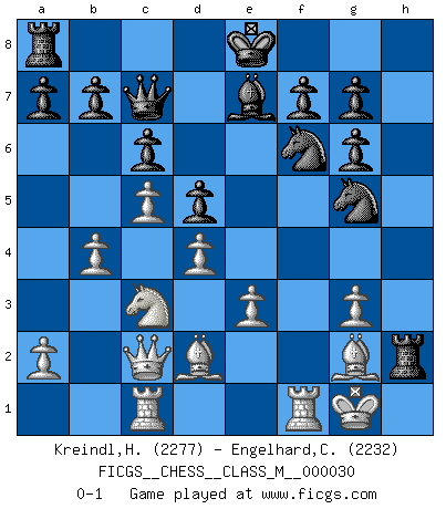 Last move : 0-1 2009 October 9 10:9:22 [Event "FICGS__CHESS__CLASS_M__000030"] [Site "FICGS"] [Date "2009.07.27"] [Round "1"] [White "Kreindl,Helmut"] [Black "Engelhard,Christof"] [Result "0-1"] [WhiteElo "2277"] [BlackElo "2232"] 1.d4 d5 2.c4 c6 3.Nf3 Nf6 4.e3 Bf5 5.Nc3 e6 6.Nh4 Be4 7.f3 Bg6 8.Qb3 Qc7 9.Bd2 Nbd7 10.Rc1 Be7 11.g3 Nb6 12.c5 Nbd7 13.Nxg6 hxg6 14.Qc2 e5 15.Bd3 e4 16.Be2 exf3 17.Bxf3 Nf8 18.O-O Ne6 19.b4 Ng5 20.Bg2 Rxh2 0-1 QGD Slav : 4.e3 Bf5 Kingside Castling by player White (move 18) Player Black won this chess game. Follow this game move after move (download)All Chess players should have a hobby. (Savielly Tartakower) Gegen einen Schachcomputer zu verlieren ist wie Löcher in den Strümpfen zuhaben. Es ist nicht peinlich, solange man der einzige ist der es weiß. (Anonymous) El Ajedrez es tan interesante por sí solo, que no es necesario un interés monetario para persuadir a una persona a que lo practique; por lo tanto, nunca se juega por dinero. (Benjamin Franklin) La conception d'un plan est le processus par lequel un joueur exploite les avantages de sa position tout en s'efforçant d'en réduire au minimum les inconvénients. Afin de garantir le succès, un plan doit toujours se fonder sur un diagnostic objectif des particularités d'une position. La conception d'un plan est d'autant plus difficile que la position est équilibrée, et grandement facilitée lorsqu'il n'existe qu'un seul plan susceptible de répondre aux exigences de la position. (Harry Golombek) The question of whether computers can think is just like question of whether submarines can swim. (Edsger W. Dijkstra)