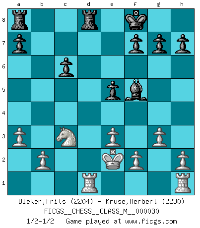 Last move : 1/2-1/2 2009 October 6 16:53:49 [Event "FICGS__CHESS__CLASS_M__000030"] [Site "FICGS"] [Date "2009.07.27"] [Round "1"] [White "Bleker,Frits"] [Black "Kruse,Herbert"] [Result "1/2-1/2"] [WhiteElo "2204"] [BlackElo "2230"] 1.d4 Nf6 2.c4 e6 3.Nc3 Bb4 4.Nf3 c5 5.g3 Nc6 6.Bg2 d5 7.cxd5 Nxd5 8.Bd2 cxd4 9.Nxd4 Nxd4 10.Nxd5 Bxd2+ 11.Qxd2 e5 12.Nc3 O-O 13.Rd1 Bf5 14.e3 Nc2+ 15.Kf1 Nb4 16.a3 Nc6 17.Bxc6 bxc6 18.Qxd8 Rfxd8 19.Ke2 Kf8 1/2-1/2 Nimzo-Indian : Three knights variation Kingside Castling by player Black (move 12) This chess game ended in a draw. Follow this game move after move (download)Chess is the gymnasium of the mind. (Blaise Pascal) Kann Schach nicht schließlich das Nationalspiel der Deutschen werden? Und welche weiteren Ausblicke bieten sich dann dar! Welche Hebung des allgemeinen Kultur-Niveaus, ja der Moral, wenn das Schachbrett den Kartentisch verdrängen würde! Wahrlich, ein Ziel, des Schweißes der Edlen wert! (Siegbert Tarrasch) Alekhine es un poeta que crea un trabajo de arte de algo que raramente inspiraría a otra persona a mandar una tarjeta postal. (Max Euwe) Il s'avisa de me proposer d'apprendre les échecs qu'il jouait un peu... me voilà forcené des échecs. J'achète un échiquier, je m'enferme dans ma chambre, j'y passe des jours et des nuits à vouloir apprendre par cur toutes les parties. (Jean-Jacques Rousseau, Confessions) Now you put water in a cup, it becomes the cup; You put water into a bottle it becomes the bottle; You put it in a teapot it becomes the teapot. Water can flow or it can crash. Be water, my friend. (Bruce Lee)