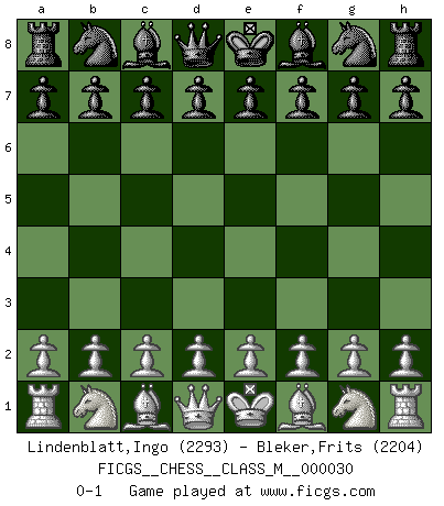 Last move : 0-1 2009 September 6 10:16:4 [Event "FICGS__CHESS__CLASS_M__000030"] [Site "FICGS"] [Date "2009.07.27"] [Round "1"] [White "Lindenblatt,Ingo"] [Black "Bleker,Frits"] [Result "0-1"] [WhiteElo "2293"] [BlackElo "2204"] 0-1 This chess game has been lost on time (started : 2009.07.27 18:33:39) Player Black won this chess game. Follow this game move after move (download)A sacrifice is best refuted by accepting it. (Wilhelm Steinitz) Es ist wirklich schade, dass so viele Schachspieler nicht auf ihr Äußeres achten! (Alexandra Kosteniuk) El Ajedrez es una manera fabulosa para que los niños aprendan a autovalorarse y a autoestimarse. (Saudin Robovic) Des points faibles ou des trous dans la position de l'adversaire doivent être occupés par des pièces et non pas par des pions. (Siegbert Tarrasch) The existence of forgetting has never been proved: We only know that some things don't come to mind when we want them. (Friedrich Nietzsche)