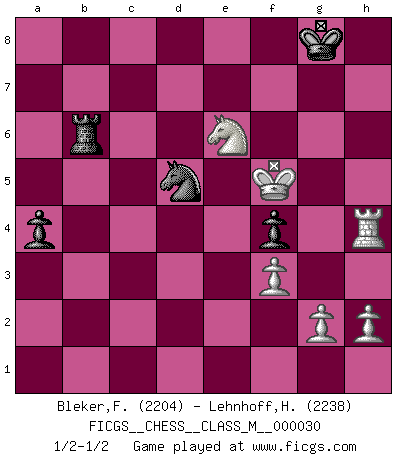 Last move : 1/2-1/2 2010 May 4 19:19:56 [Event "FICGS__CHESS__CLASS_M__000030"] [Site "FICGS"] [Date "2009.07.27"] [Round "1"] [White "Bleker,Frits"] [Black "Lehnhoff,Heinz-Georg"] [Result "1/2-1/2"] [WhiteElo "2204"] [BlackElo "2238"] 1.Nf3 Nf6 2.c4 e6 3.Nc3 d5 4.d4 Be7 5.Bf4 O-O 6.e3 c5 7.dxc5 Bxc5 8.Qc2 Nc6 9.a3 Qa5 10.Rd1 Be7 11.Be2 Ne4 12.cxd5 Nxc3 13.bxc3 exd5 14.O-O Be6 15.a4 Rac8 16.Rb1 Bf6 17.Rxb7 Nd8 18.Rb5 Qxc3 19.Qxc3 Rxc3 20.Bd6 Re8 21.Rb8 Bc8 22.Ra8 Nc6 23.Bb5 Bd7 24.Rxe8+ Bxe8 25.Rd1 Bd7 26.Rxd5 Rc1+ 27.Bf1 Ra1 28.Bc5 Bc8 29.Rd6 Bb7 30.Rd7 Ba6 31.Nd2 Bc3 32.Bd4 Bxd4 33.exd4 g6 34.d5 Nd4 35.f3 Bxf1 36.Nxf1 Rxa4 37.Nd2 f5 38.Rb7 a5 39.Kf2 Kf8 40.Rxh7 f4 41.Ne4 Ra2+ 42.Ke1 Nc2+ 43.Kd2 Nb4 44.Kc3 Nxd5+ 45.Kd4 Ne7 46.Ke5 Rb2 47.Ng5 Rb7 48.Ne6+ Kg8 49.Rh4 Rb5+ 50.Kf6 Nd5+ 51.Kxg6 Rb6 52.Kf5 a4 1/2-1/2 Reti Opening Kingside Castling by player Black (move 5) Kingside Castling by player White (move 14) This chess game ended in a draw. Follow this game move after move (download)That's what Chess is all about. One day you give your opponent a lesson, the next day he gives you one. (Bobby Fischer) Die Fehler sind da, Sie warten nur darauf gemacht zu werden. (Savielly Grigorievitsch Tartakower) No puedes jugar al Ajedrez si eres de corazón noble. (Proverbio Francés) RxDa4 pat (...) Drag your thoughts away from your troubles... by the ears, by the heels, or any other way you can manage it. (Mark Twain)